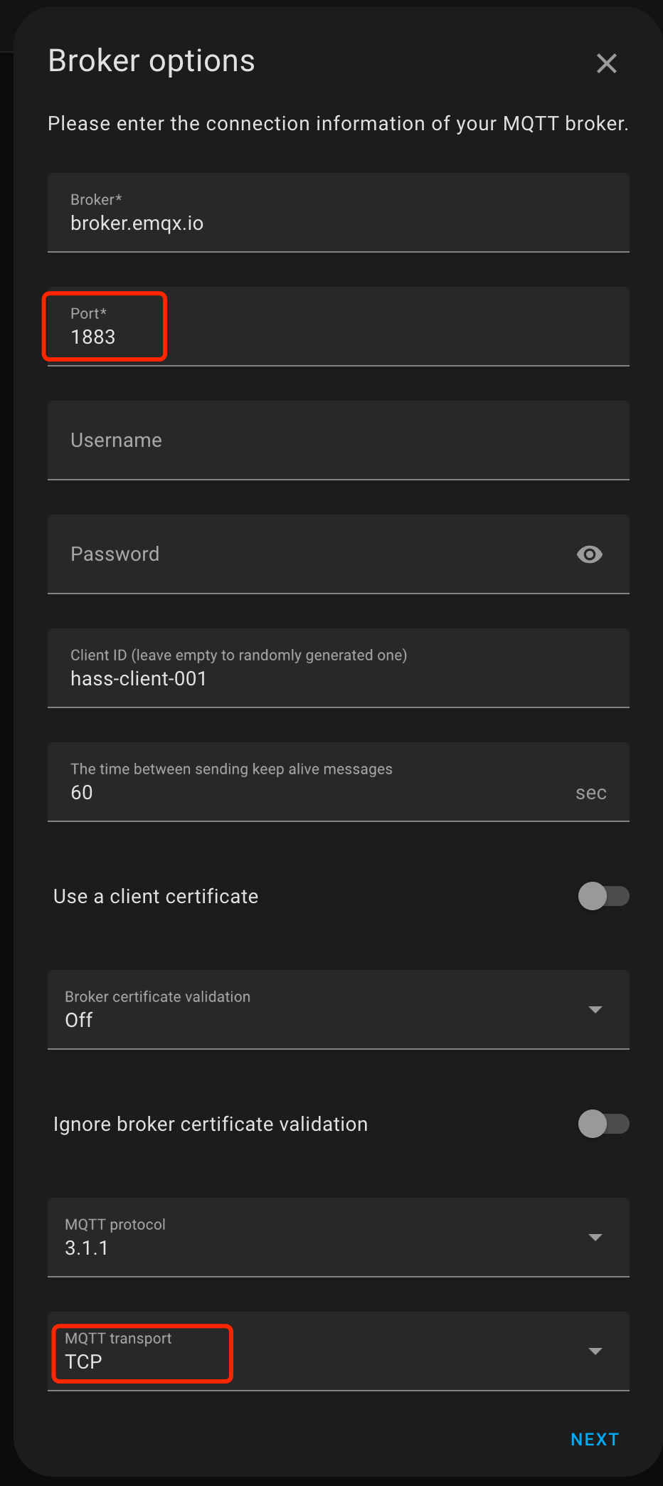 This section describes how to connect a homeassistant client to MQTT broker over TCP port.