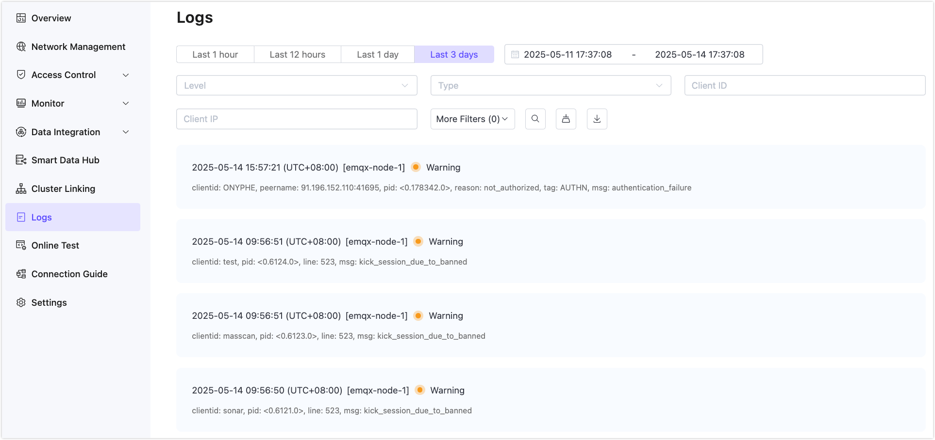 Logs are a vital resource for troubleshooting issues and optimizing the performance of your EMQX Broker deployment. Deployment logs capture information about access, operations, and network events. Through the EMQX Cloud console, you can view logs in real-time or download them for offline analysis.