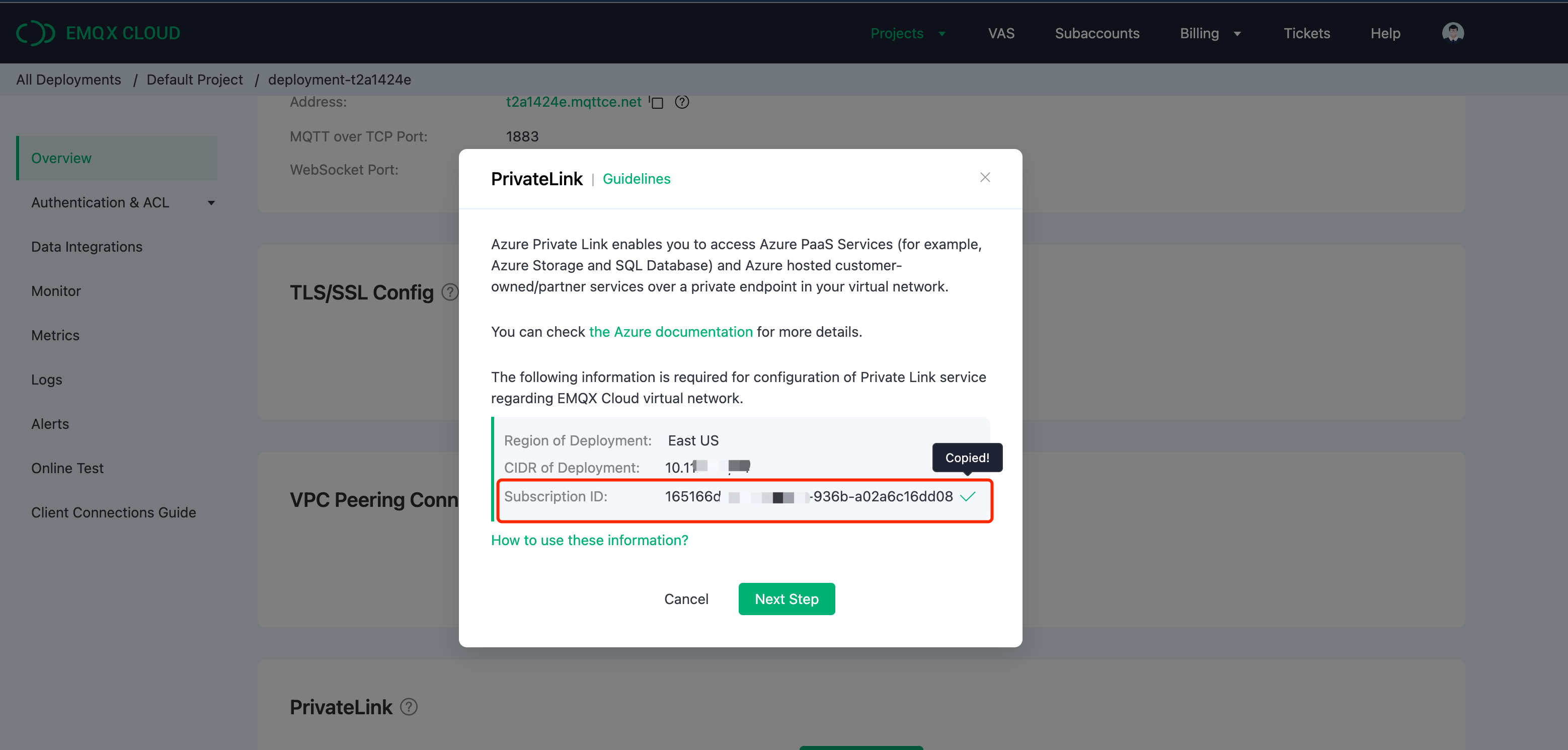 Go to the EMQX Cloud Console. Click Next Step, paste the alias you just copied in the Enter the ID of Private Link Service textbox. Click Create PrivateLink.