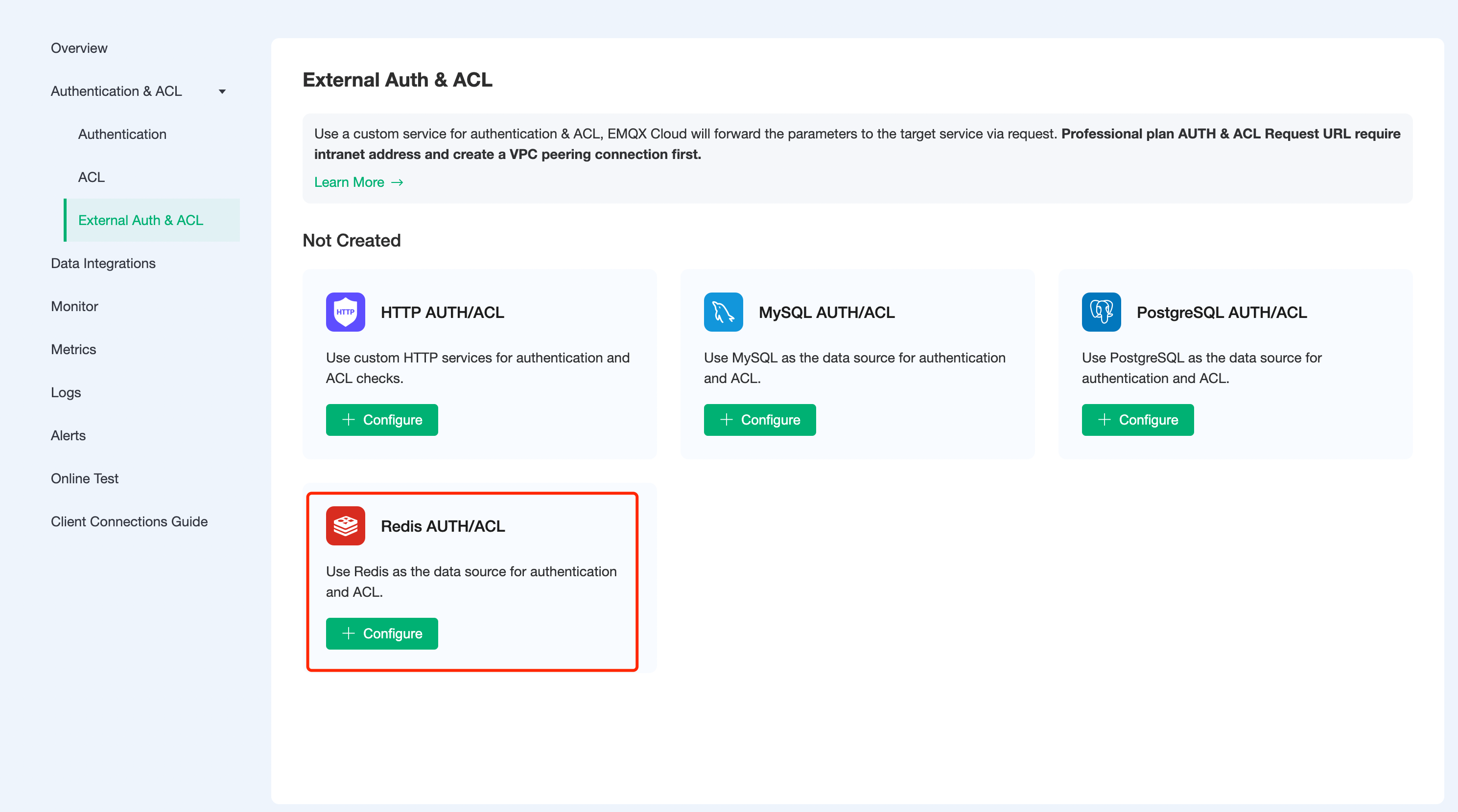 As one method of password authentication, EMQX Cloud supports password authentication through the integration of Redis. EMQX supports three Redis deployment modes: Single Node, Redis Sentinel, and Redis Cluster. This section will introduce how to perform related configurations.