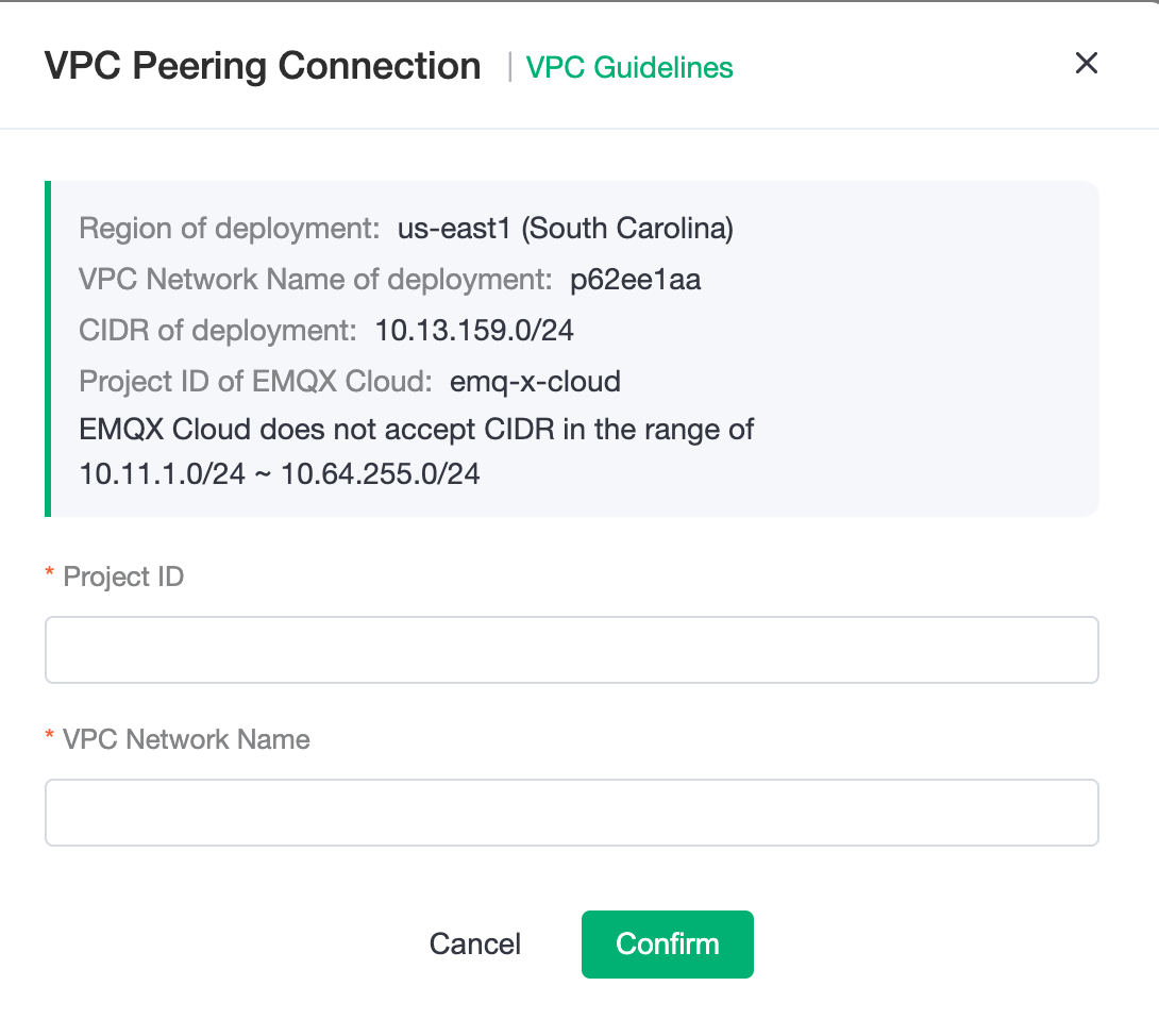 - In VPC network name, enter your EMQX Cloud VPC Network Name. You can find this name in the VPC Peering view in EMQX Cloud.