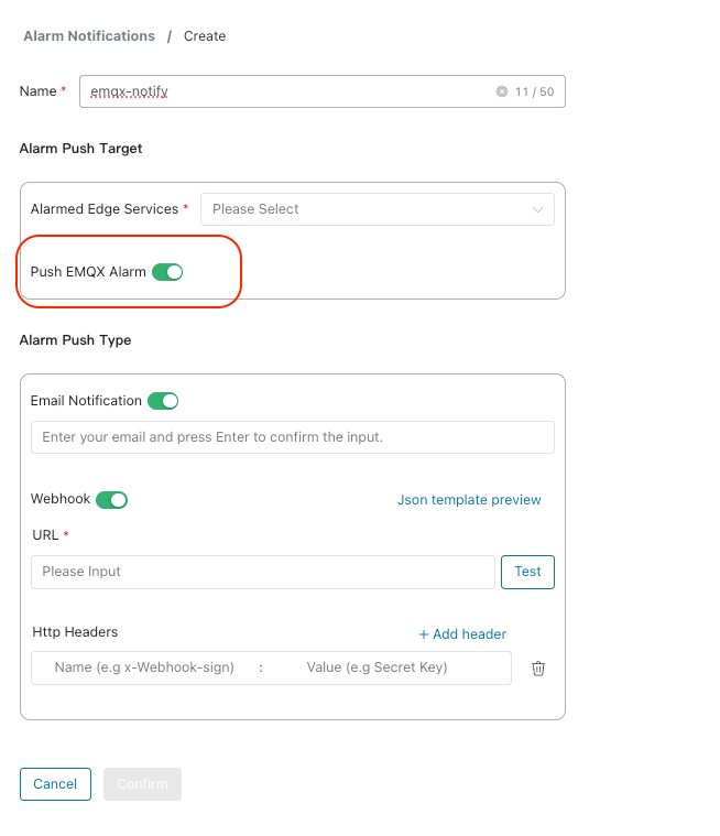 To notify cluster alarms by email or Webhook, enable "Push EMQX Alarm" when creating notification.