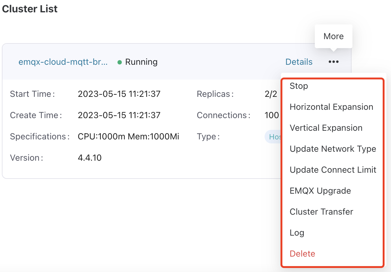 - On the target cluster, click the more icon and select Delete and confirm the action. ECP will try to remove the cluster. Please note that only the management relationship between ECP and EMQX cluster will be terminated, but the EMQX cluster itself will not be destroyed.