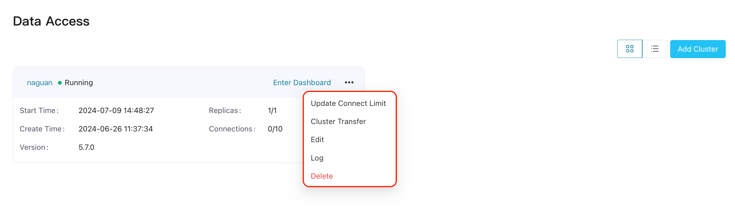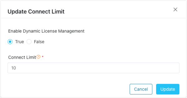 On the specific cluster, click the more icon and select Update Connect Limit. If the dynamic license management is diabled, click the