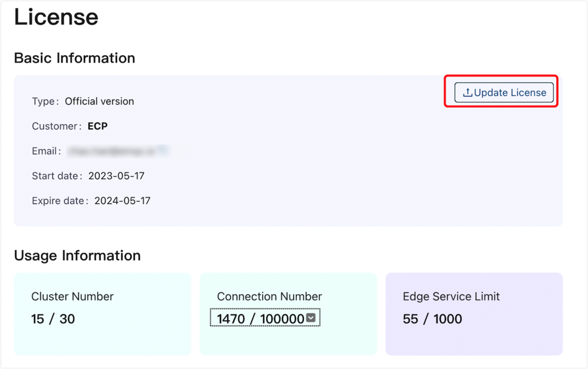 To update the license, simply select and upload a new license file. The system will automatically update the following based on the new license: