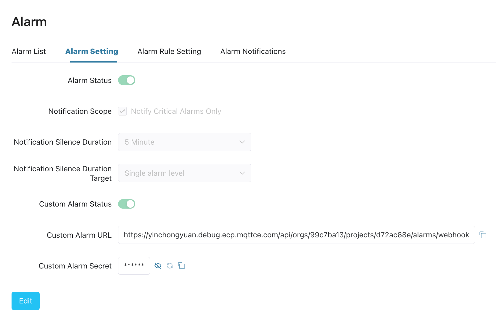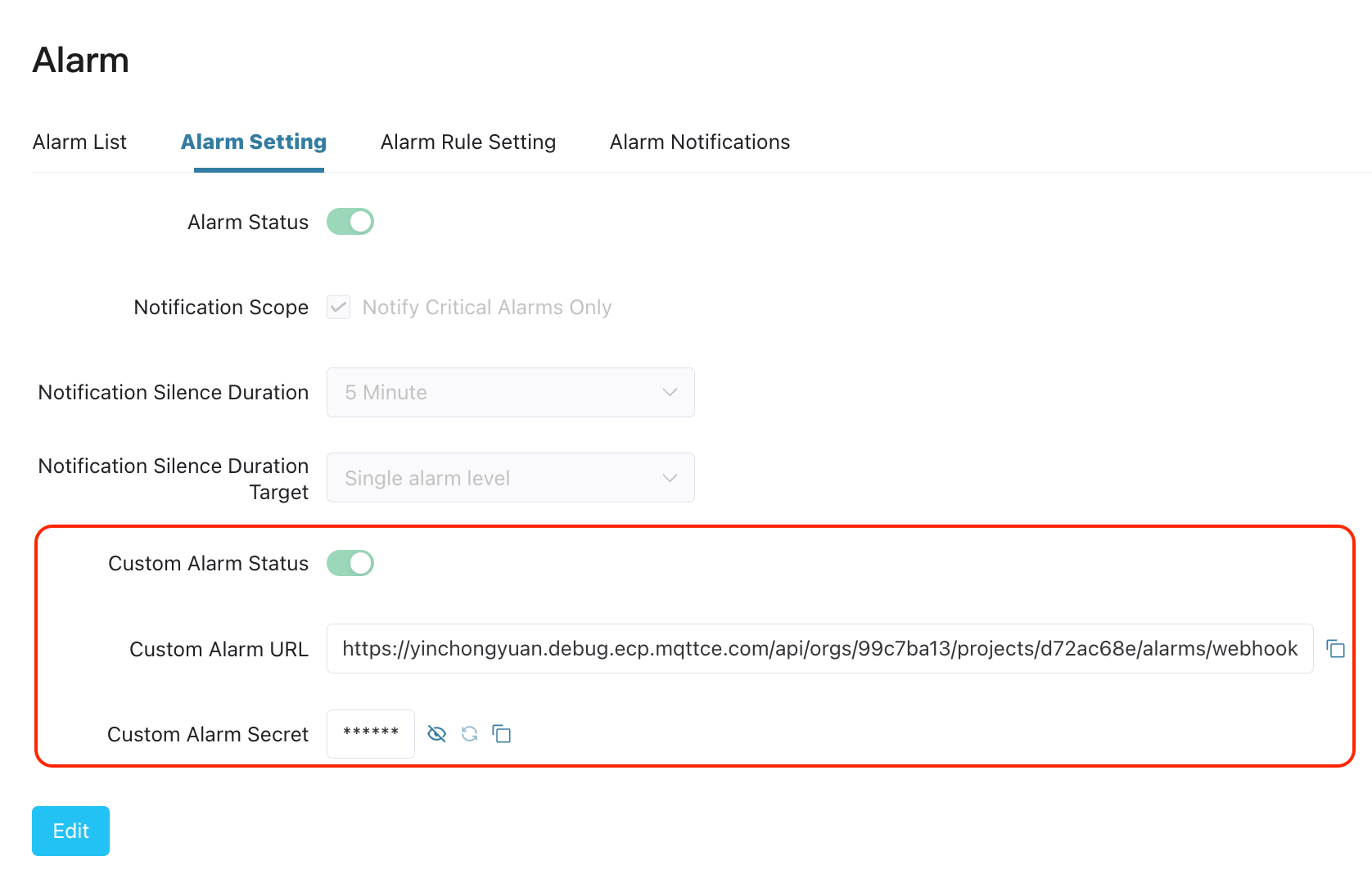 In the Alarm Setting page, enable Custom Alarm Status, then you can view and copy the API information of the custom alarm, including the request URL and request specified secret. If you need to reset the secret, please regenerate it through the "Refresh" button.