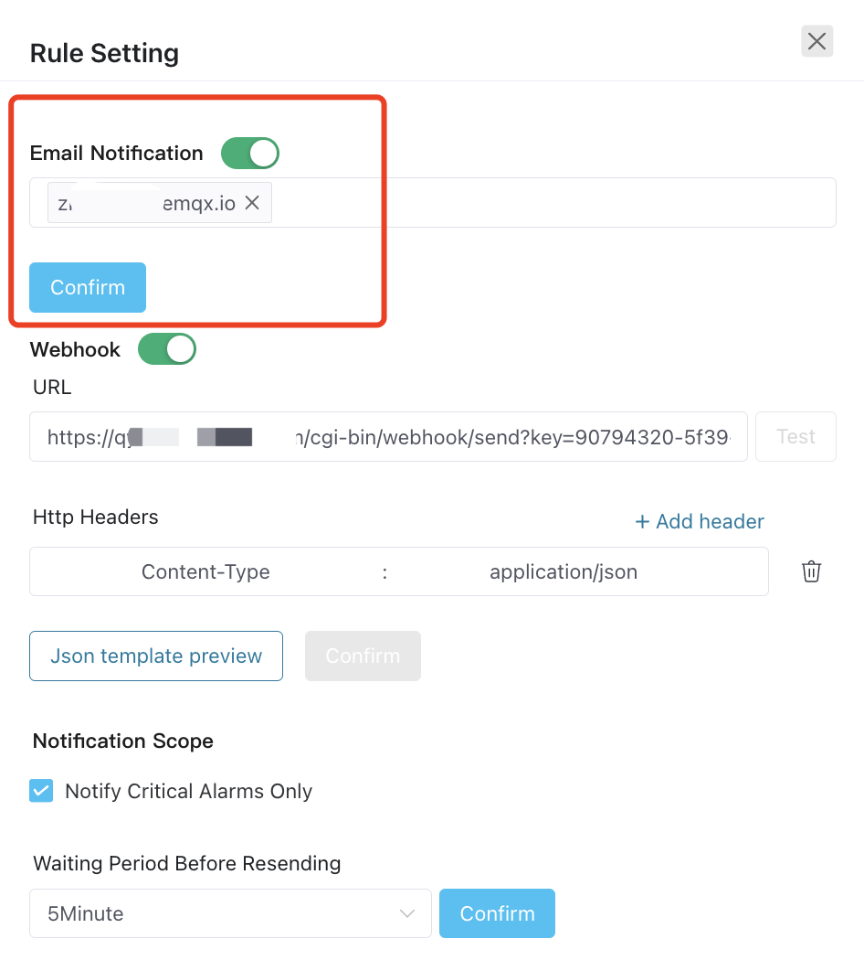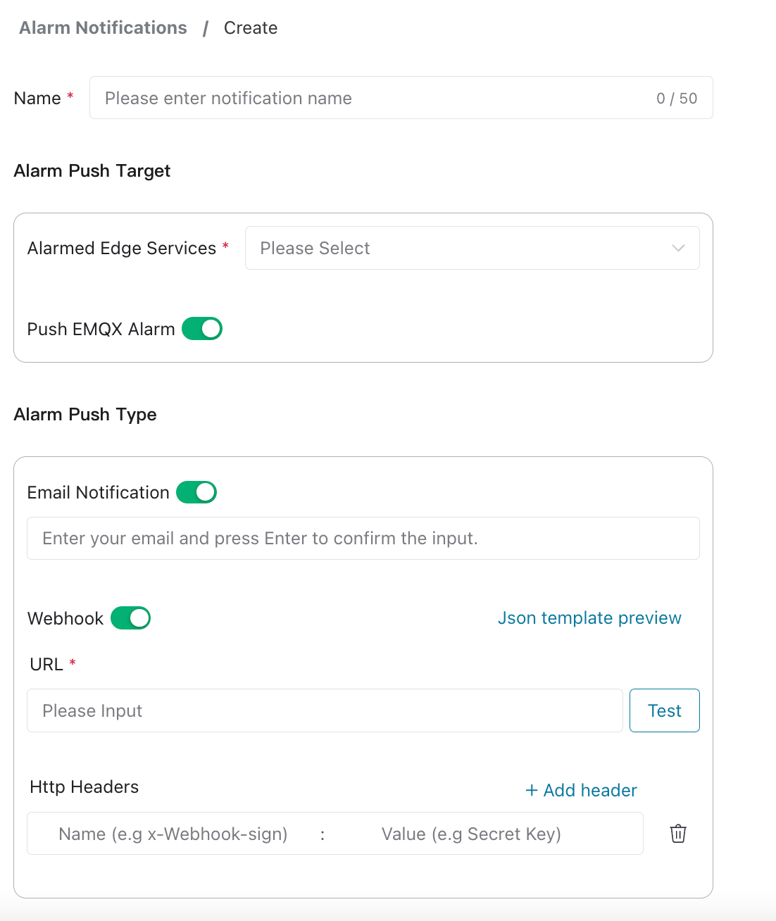 If "Push EMQX Alarm" is enabled, any alarm generated on clusters within the project will be sent to the email or Webhook.