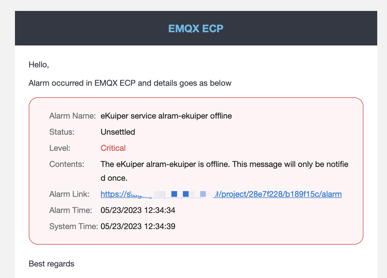 timestampfield must be specified, the type is a string, indicating the timestamp of the alarm occurrence (in seconds). Alarm messages older than 10 minutes will not be received. - The value of the