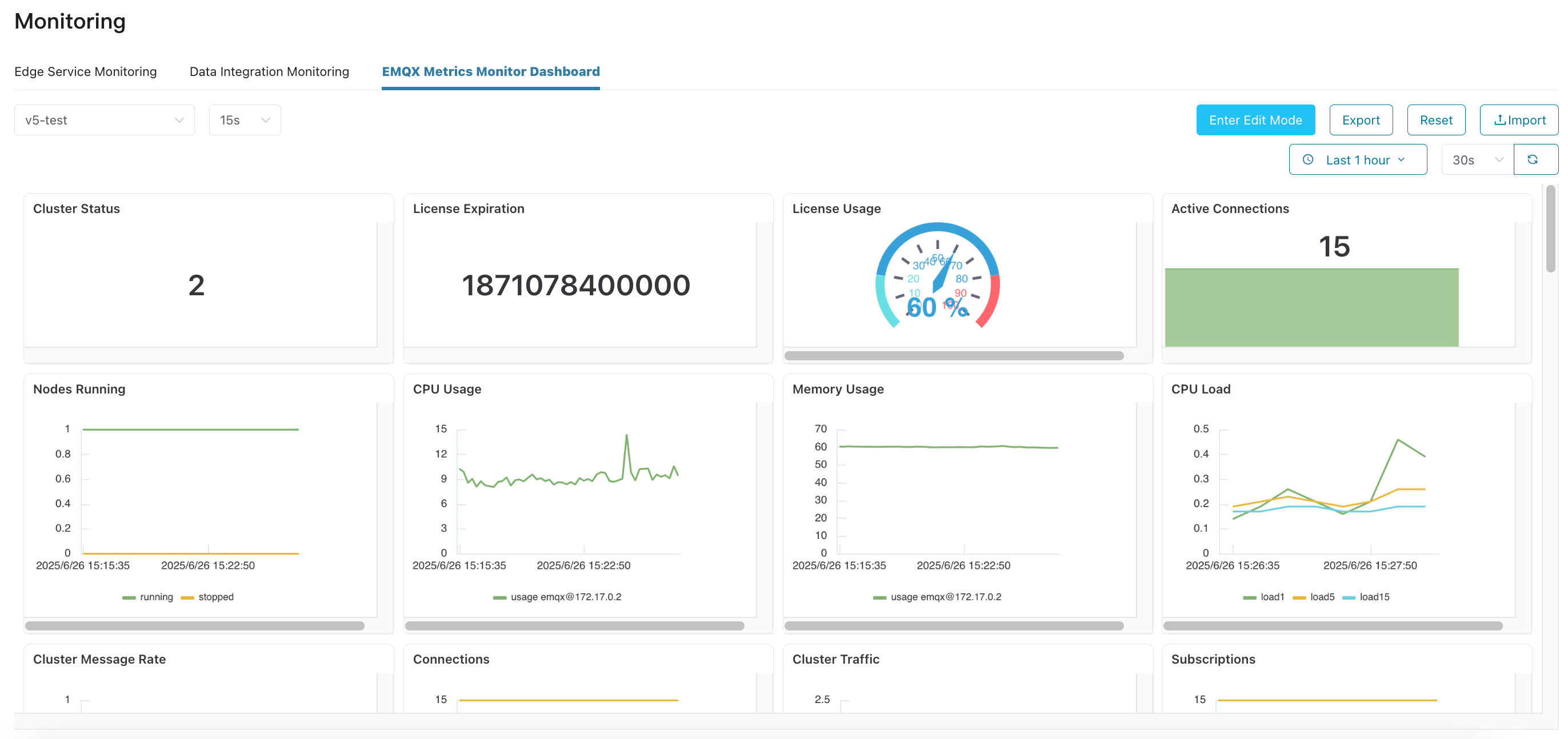 This page provides a monitoring dashboard based on EMQX v5 metrics. It includes 30+ core EMQX monitoring metrics by default, displayed in chart types such as line charts, stat charts, tables, and gauges. It also supports user-customized dashboard layout and content.