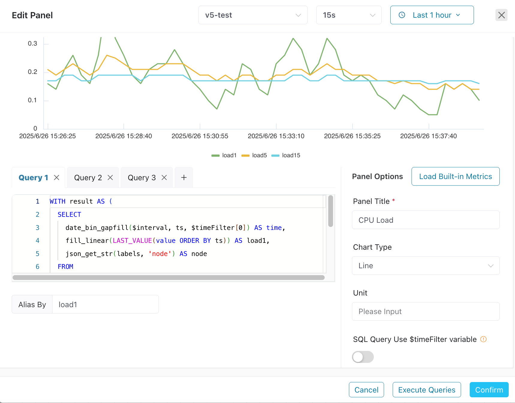 - Load Built-in Metrics: Load built-in metric panels based on the selected chart type to help users quickly build custom panel content.