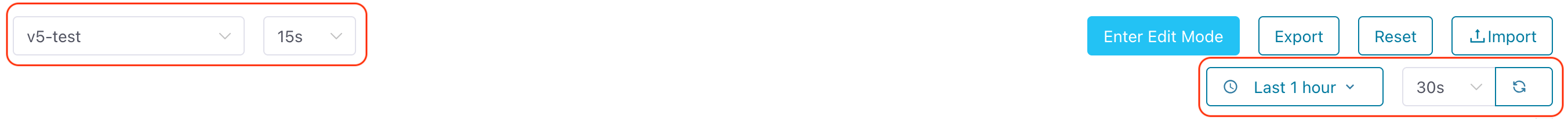 Clusterto view metrics from and theInterval. The interval determines the time interval between data points in the charts. You can set an appropriate interval based on the cluster's metric push period (default 10 seconds). - From the right side of the top operation bar, select the