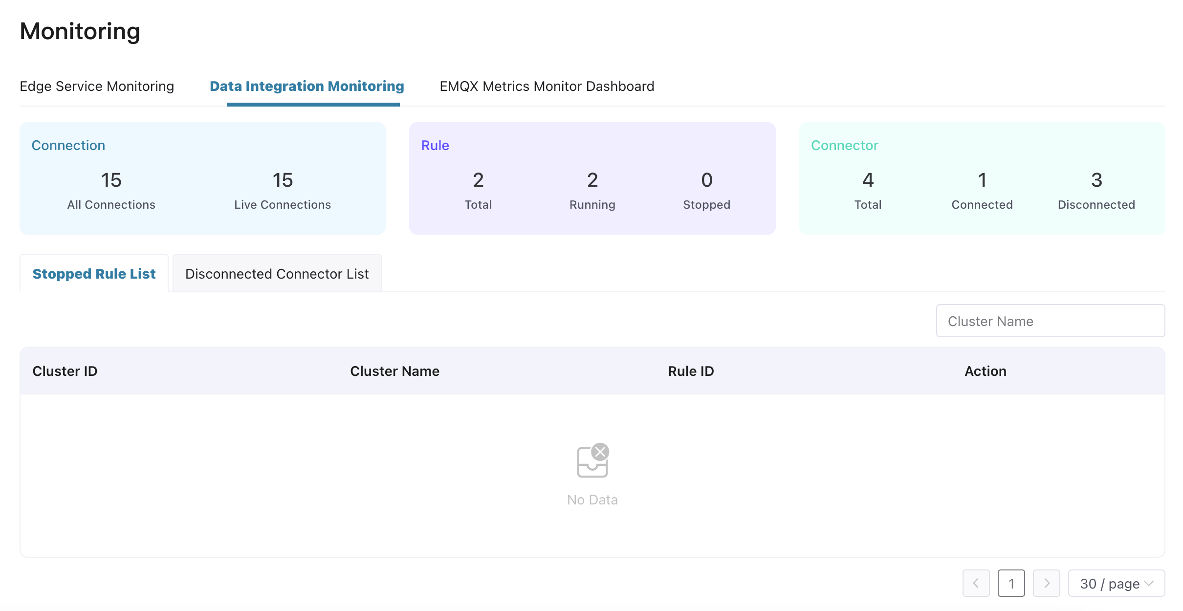 Underneath these cards, you'll find the details of stopped cluster rules and disconnected connectors lists. You can filter the lists by cluster name. Moreover, you can perform O&M actions per instance by clicking Details button from Action column.