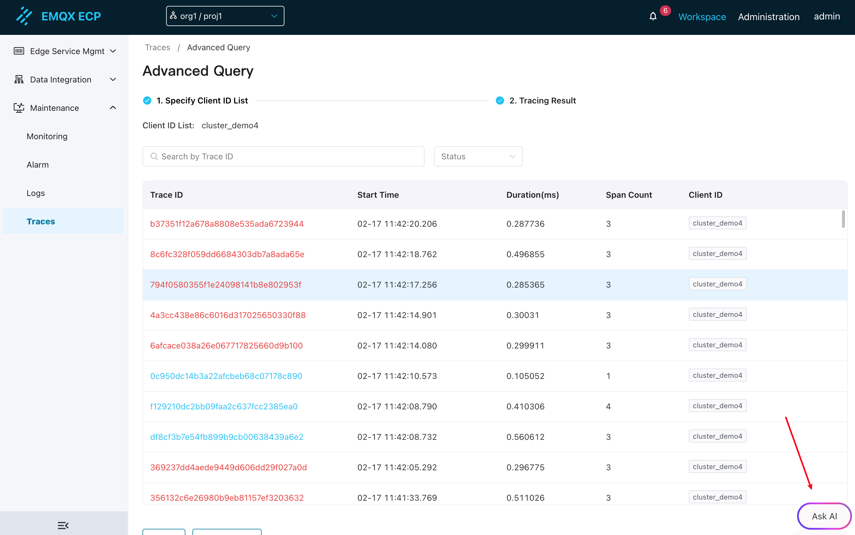 In the Traces -> Advanced Query page, you can view the tracing data for the selected client ID and time range.