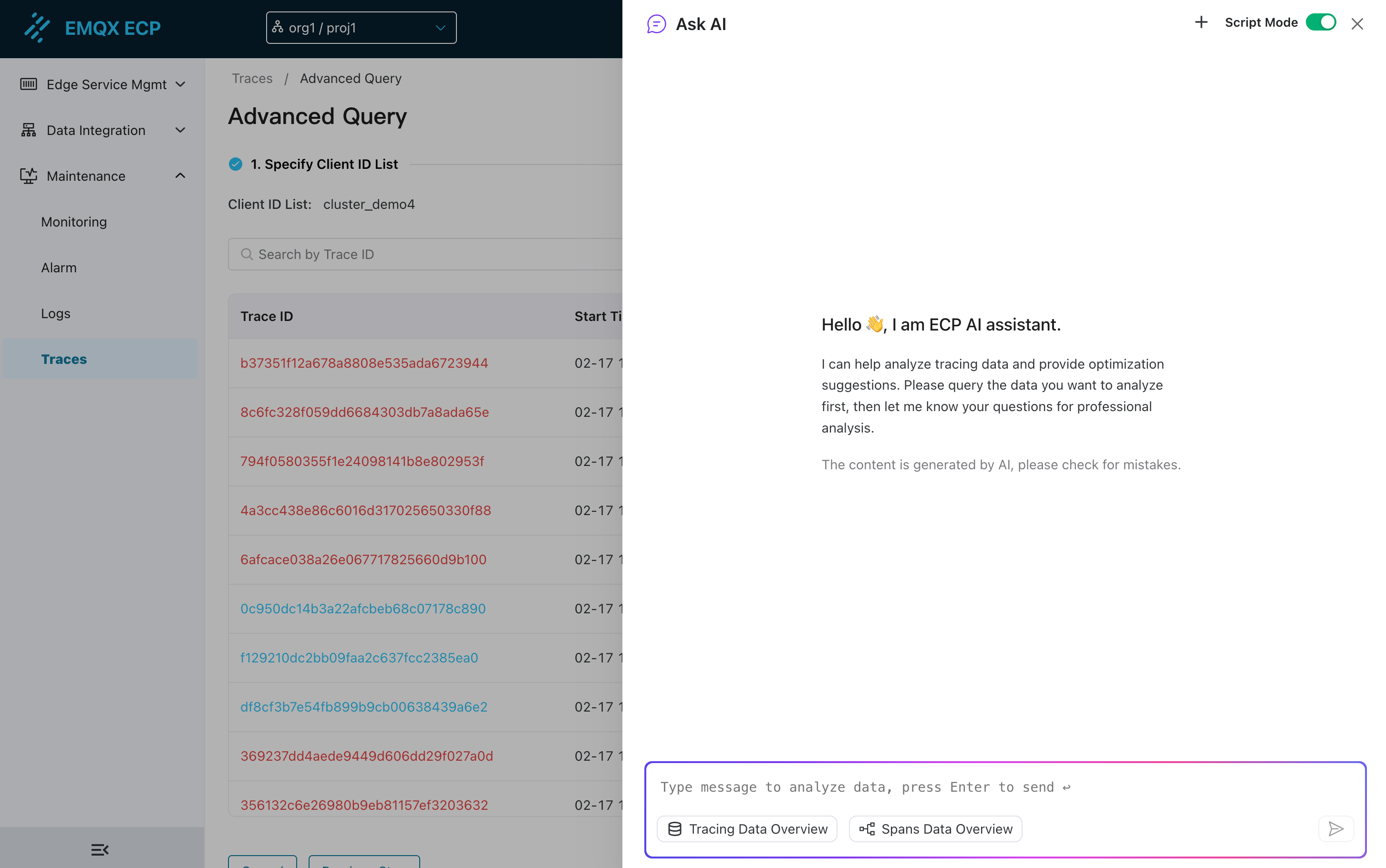 ECP integrates OpenTelemetry tracing capabilities, enabling the tracking of link data across EMQX clusters and NeuronEX, while providing visualization tools for analyzing request performance and behavior patterns.