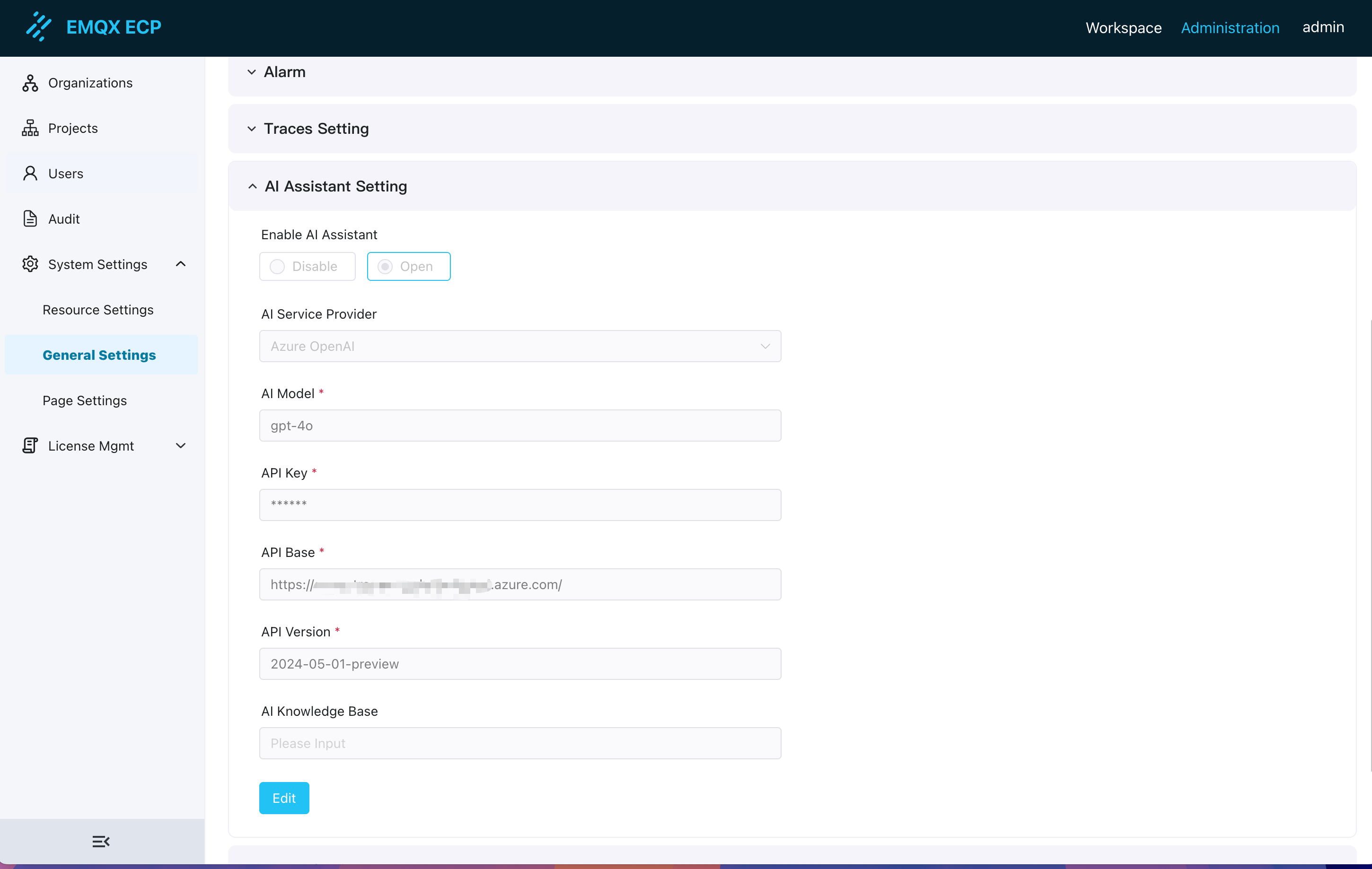 Before using the AI analysis of tracing data, you need to first configure an LLM model in the Administration -> System Settings -> General Settings page under the AI Assistant Setting item. Add a model configuration information, including the LLM model provider, AI model, and API Base information. Currently, ECP supports the following model providers: