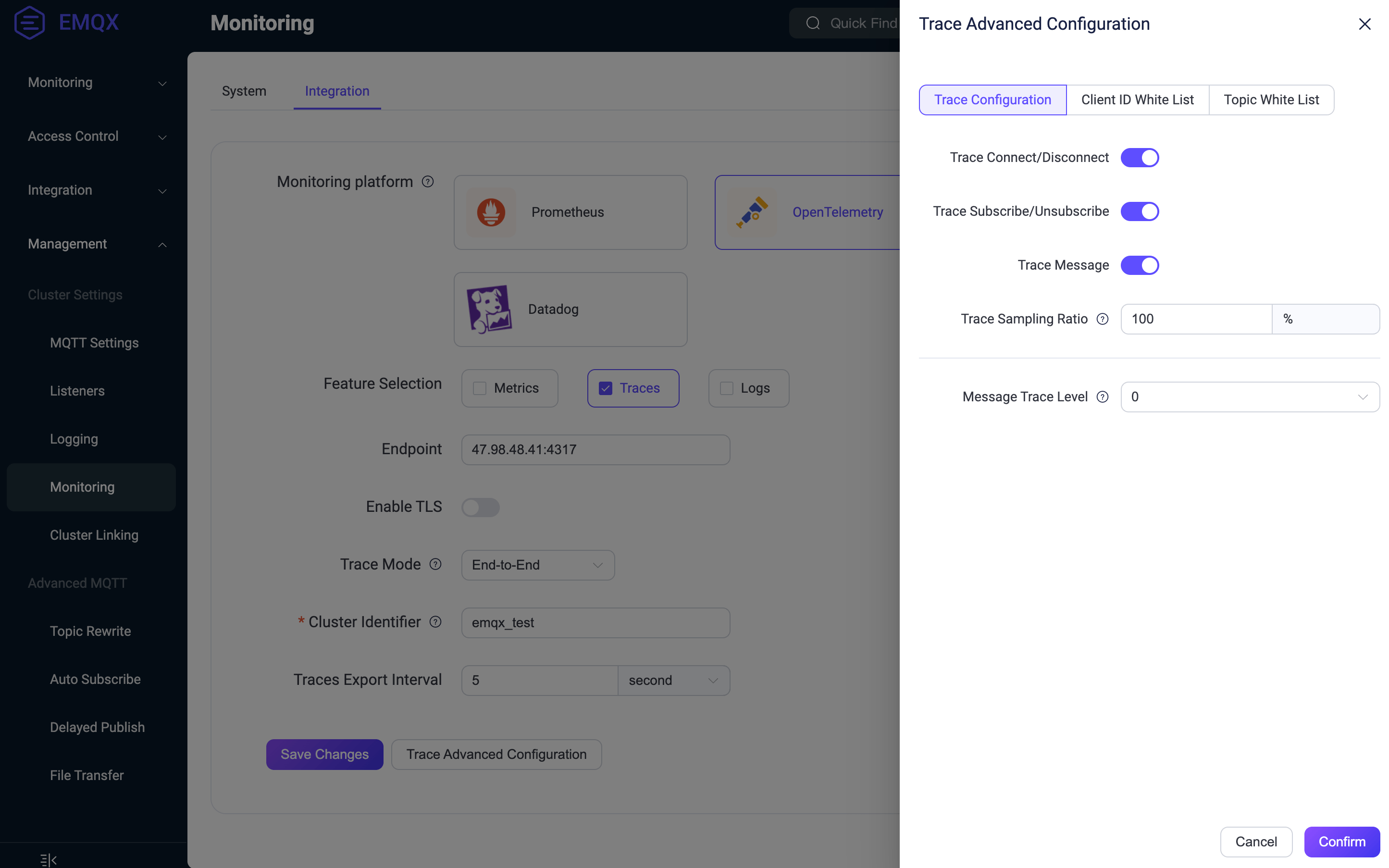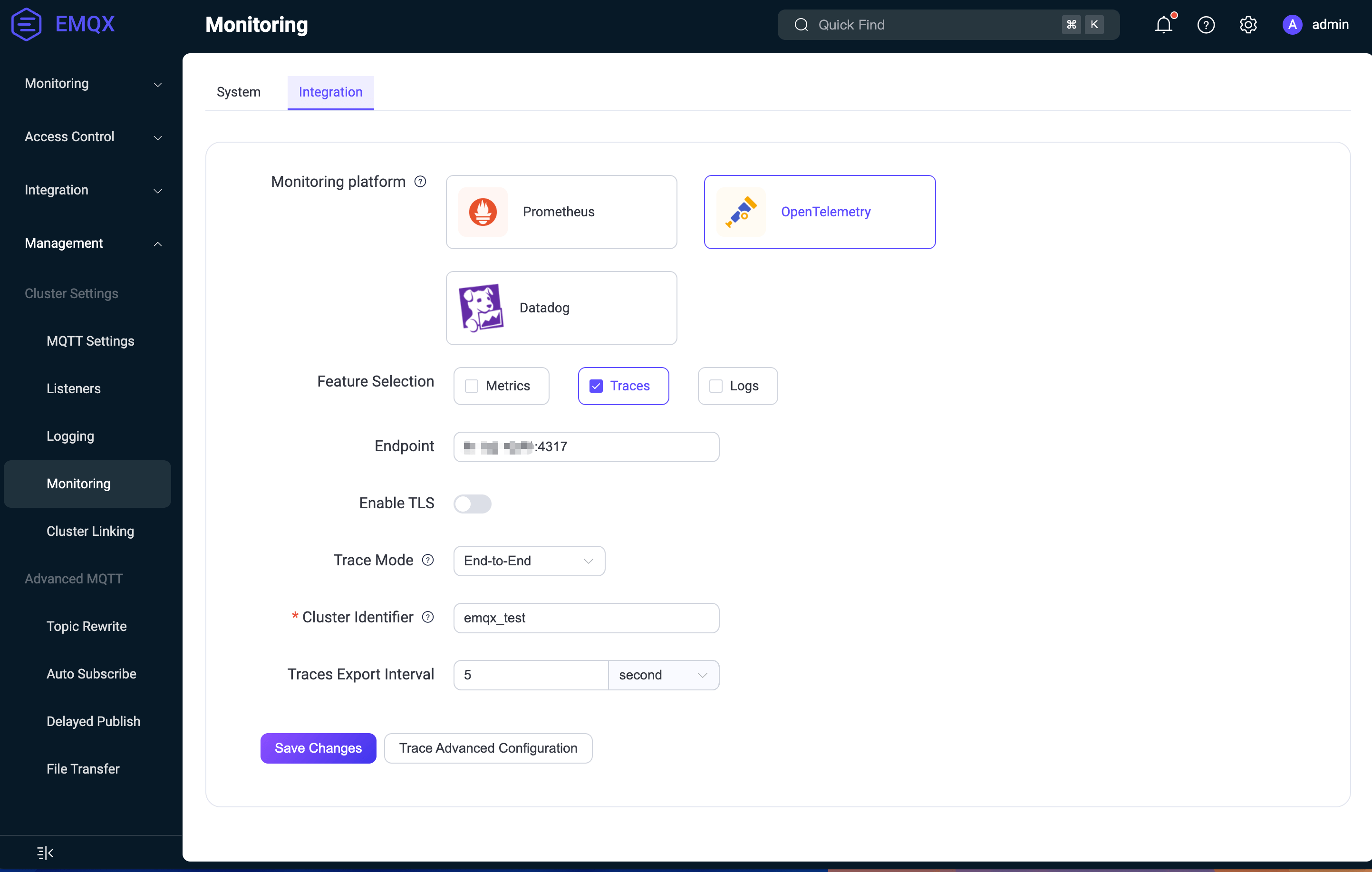 Login to the Web management page of the EMQX cluster, enter the Management -> Monitoring -> Integration page, select the OpenTelemetry tab, check the Traces function, and configure the OpenTelemetry Collector service address provided by ECP. Then, the traces data of the EMQX cluster can be sent to ECP.