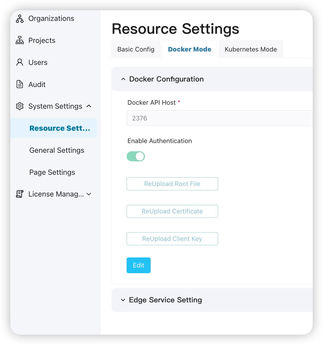 Resource settings is the configuration of the resource layer based on the ECP deployed by Docker or Kubernetes, which mainly includes Basic Config, Docker Deployment Mode Configuration, Kubernetes Deployment Mode Configuration three categories.