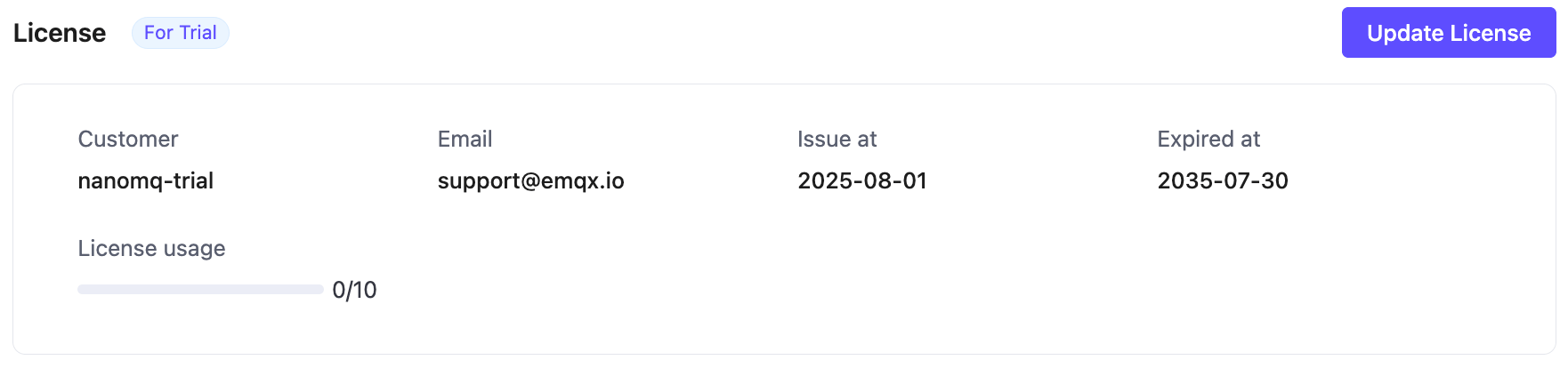 A built-in trial license is automatically included when you download EMQX Edge. It requires no application and is available for immediate use. This license has no expiration date but is limited to 10 concurrent MQTT connections. It provides basic functionality for development and testing in non-production environments.