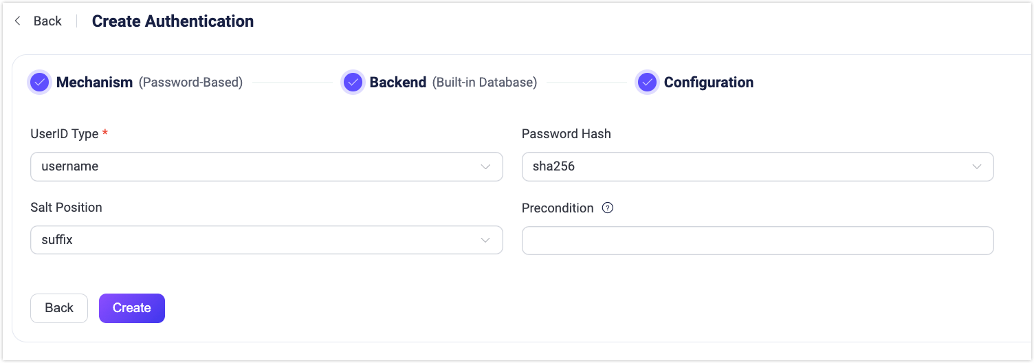3. Click to select Password-Based as Mechanism, and Built-in Database as Backend to go to the Configuration tab, as shown below.