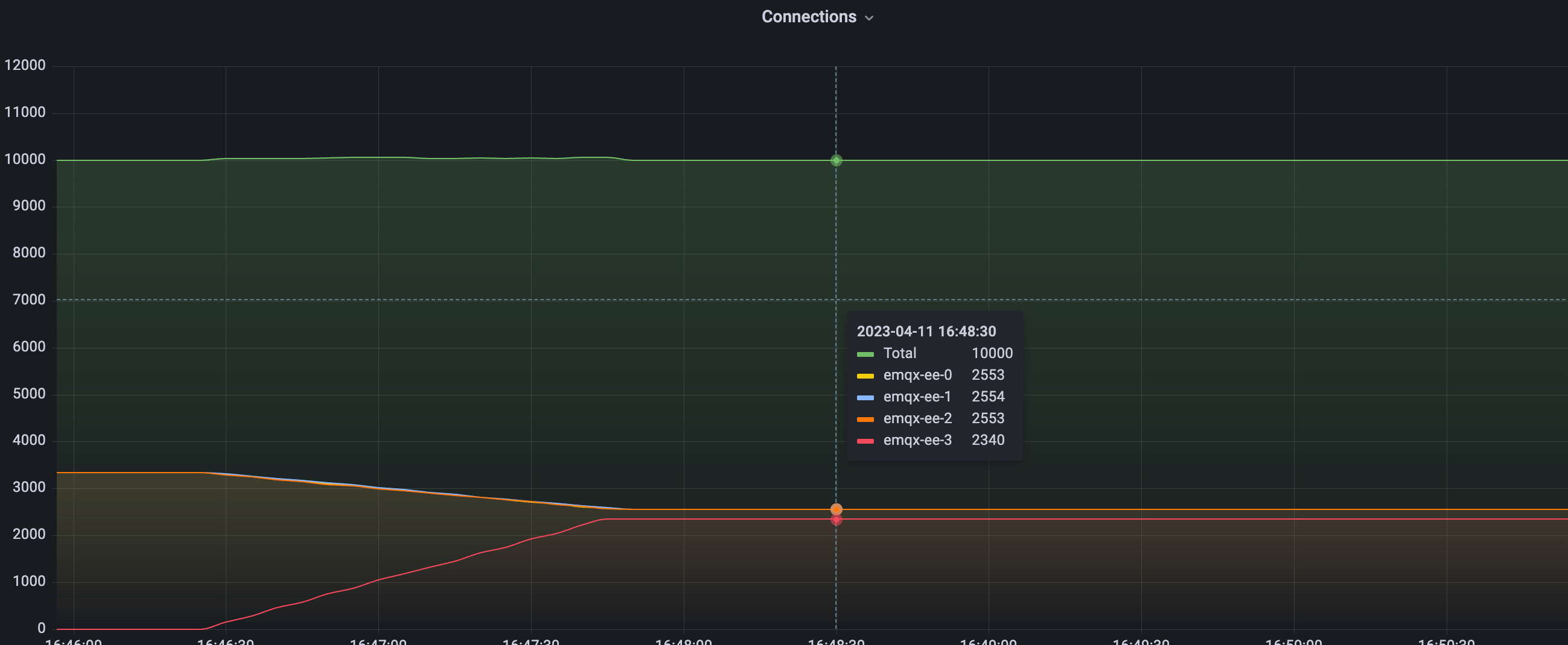 The figure above shows the cluster load after Rebalance has completed. As illustrated, the migration of client connections is smooth and stable throughout the entire operation. The total number of connections in the cluster remains 10,000, the same as before rebalancing.