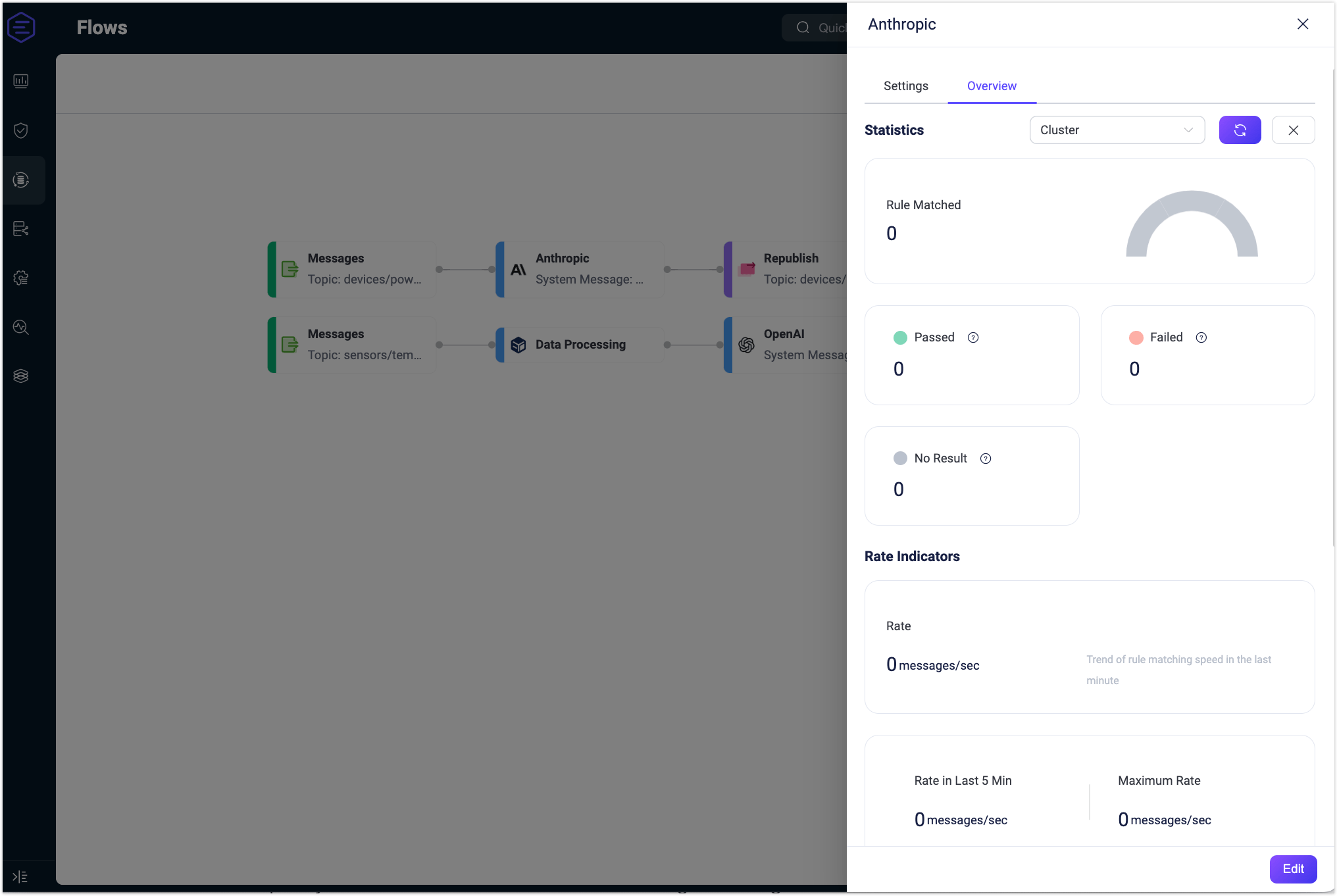 To view the running statistics and metrics of the Anthropic node, exit the editing page, click the node to open the Edit panel and click the Overview tab.