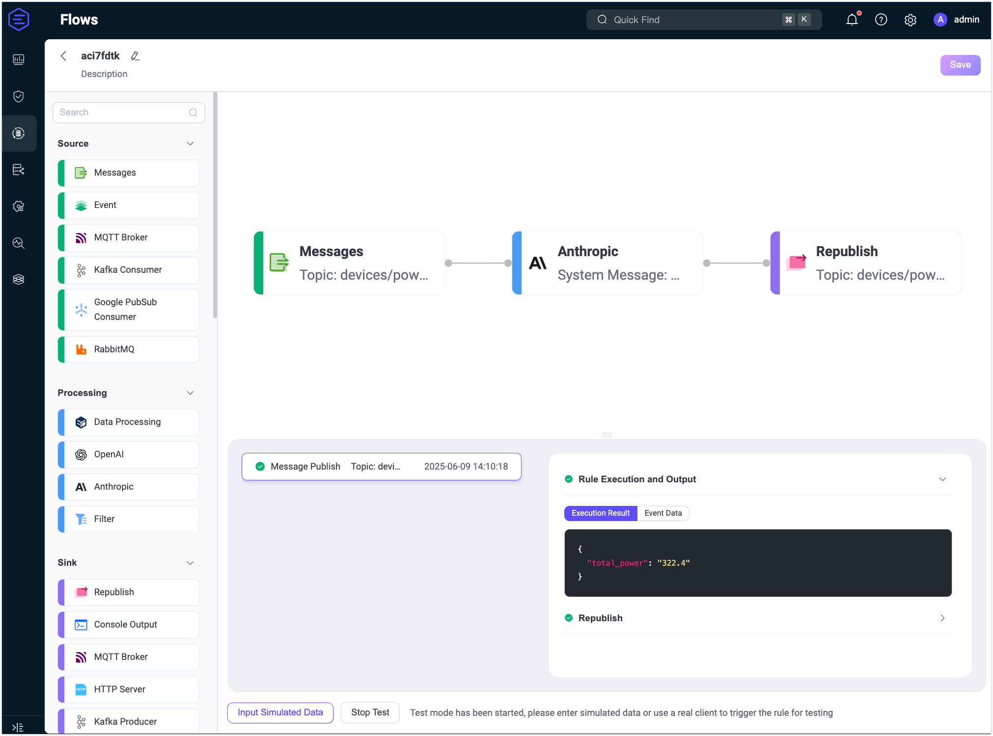 To quickly test the flow, you can use the Diagnostic Tools -> WebSocket Client on the Dashboard to simulate an MQTT client. Alternatively, you can also use the MQTTX tool or a real MQTT client: