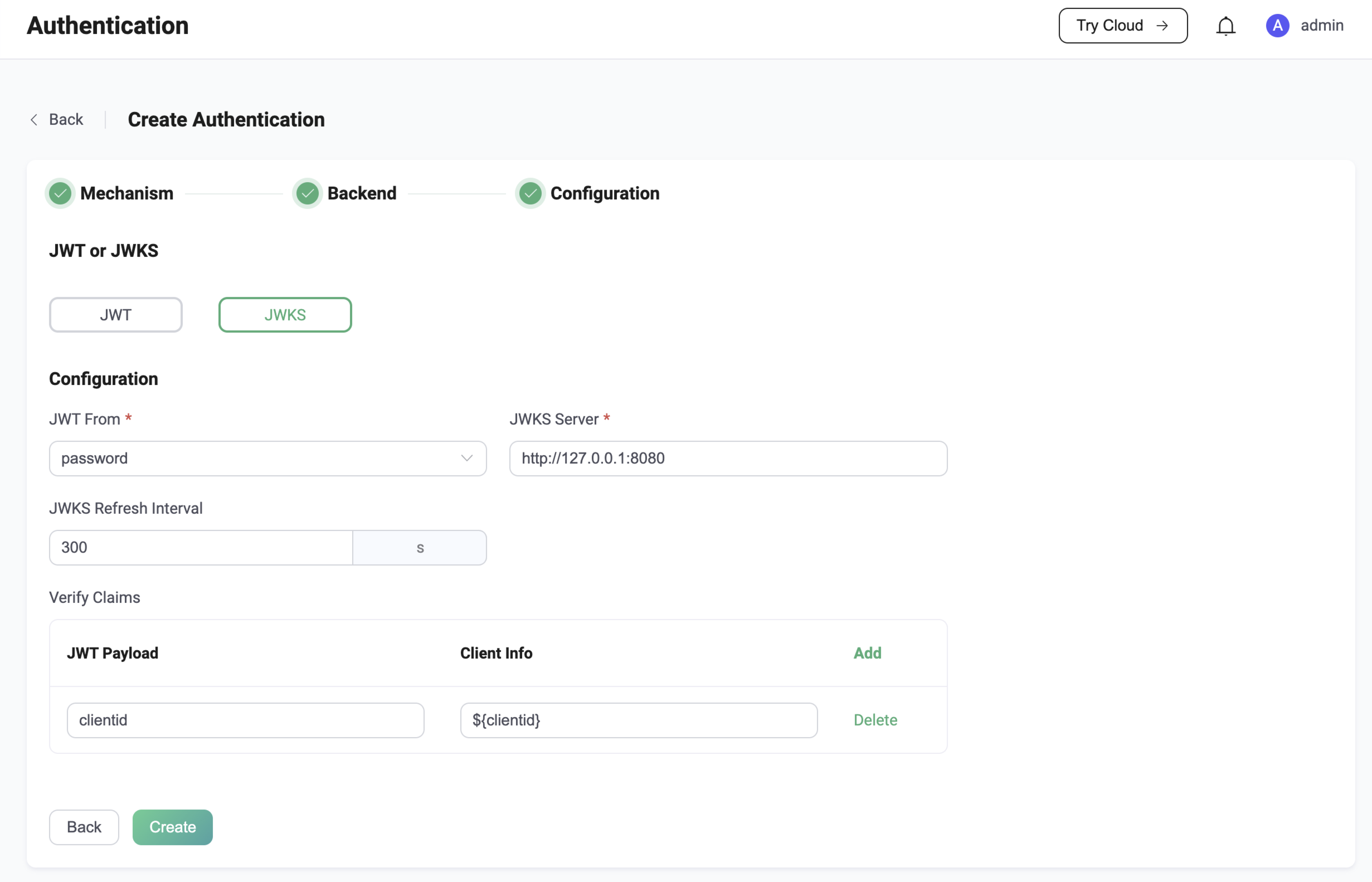 On the Authentication page, click Create in the top right corner. Click to select JWT as the Mechanism, and click Next. Skip the Backend selection and go to the Configuration tab.