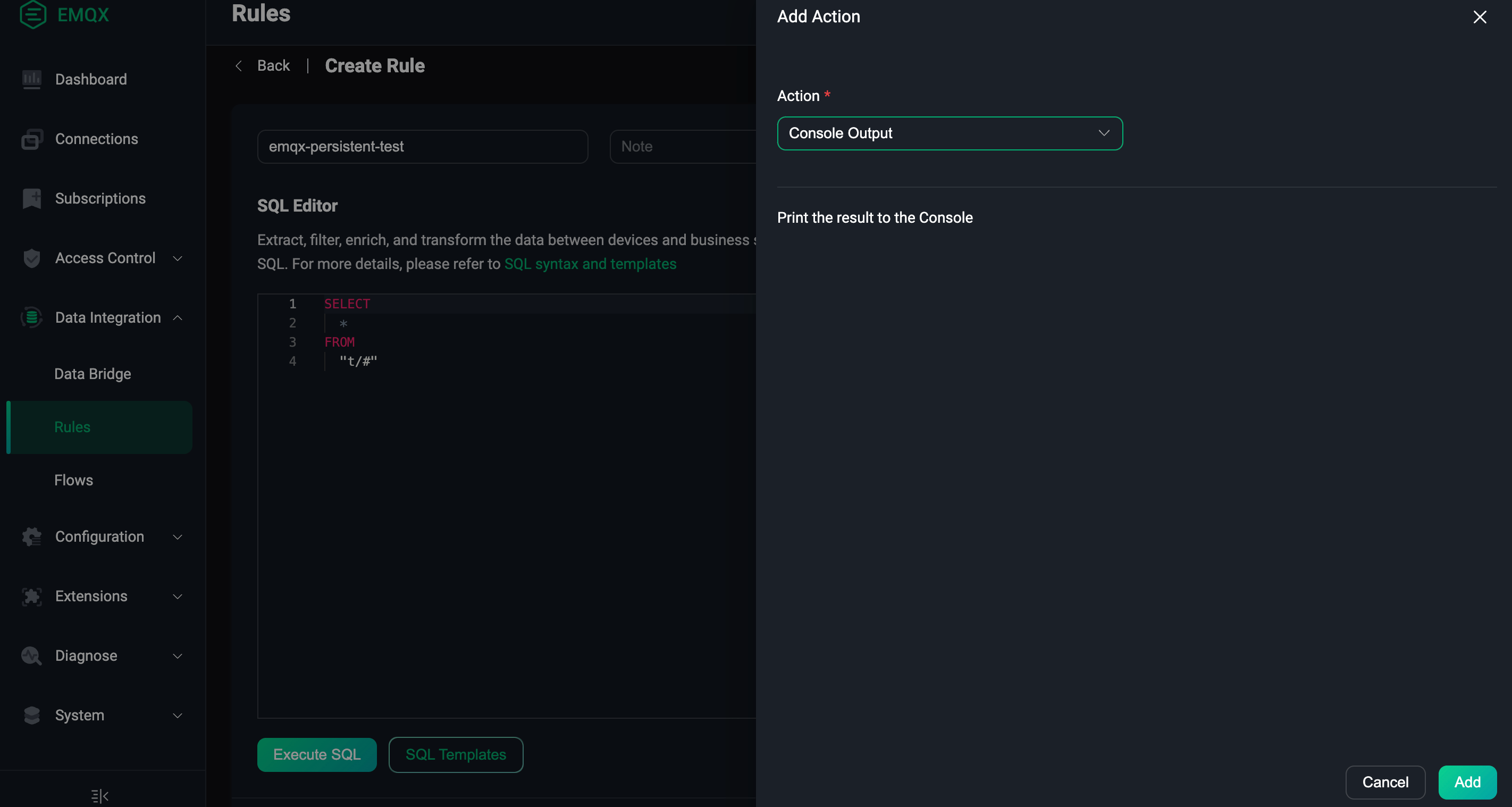 http://${external_ip}:18083. - Navigate to Data Integration → Rules to create a new rule.