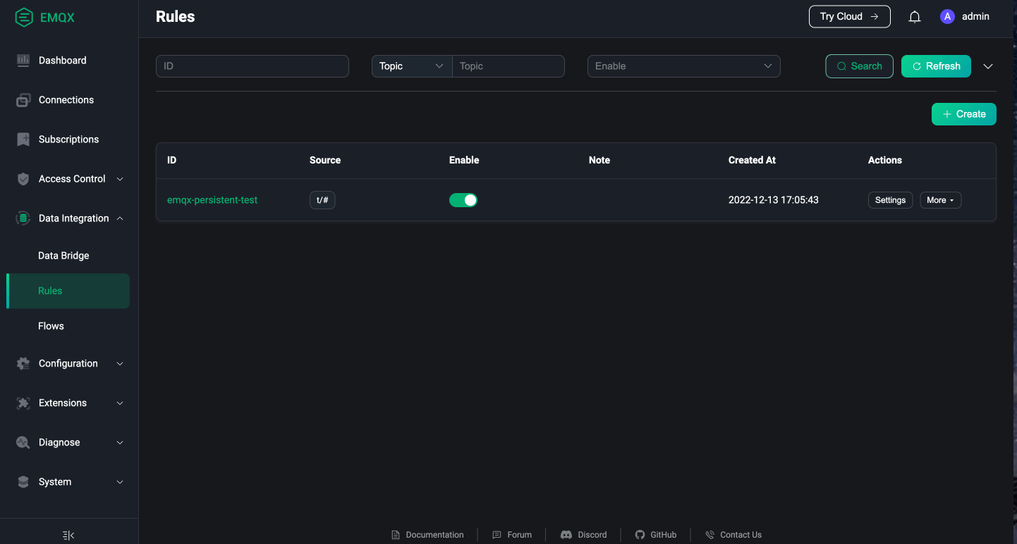Once the rule is created successfully, a corresponding record with emqx-persistent-test ID will appear on the page, as shown in the figure below: