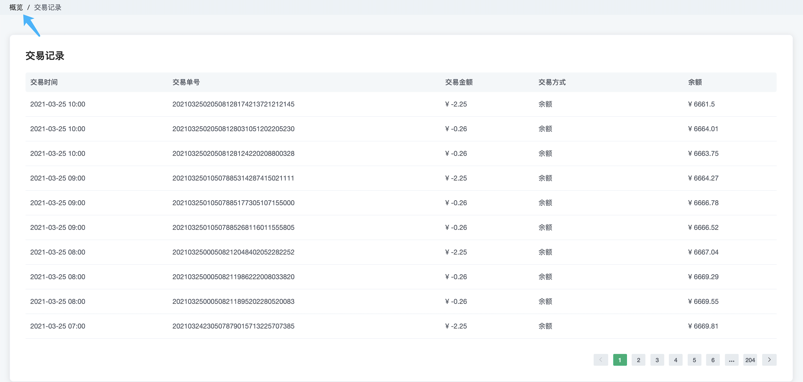 交易记录展示了账户的充值、付款等和金额交易相关的信息。