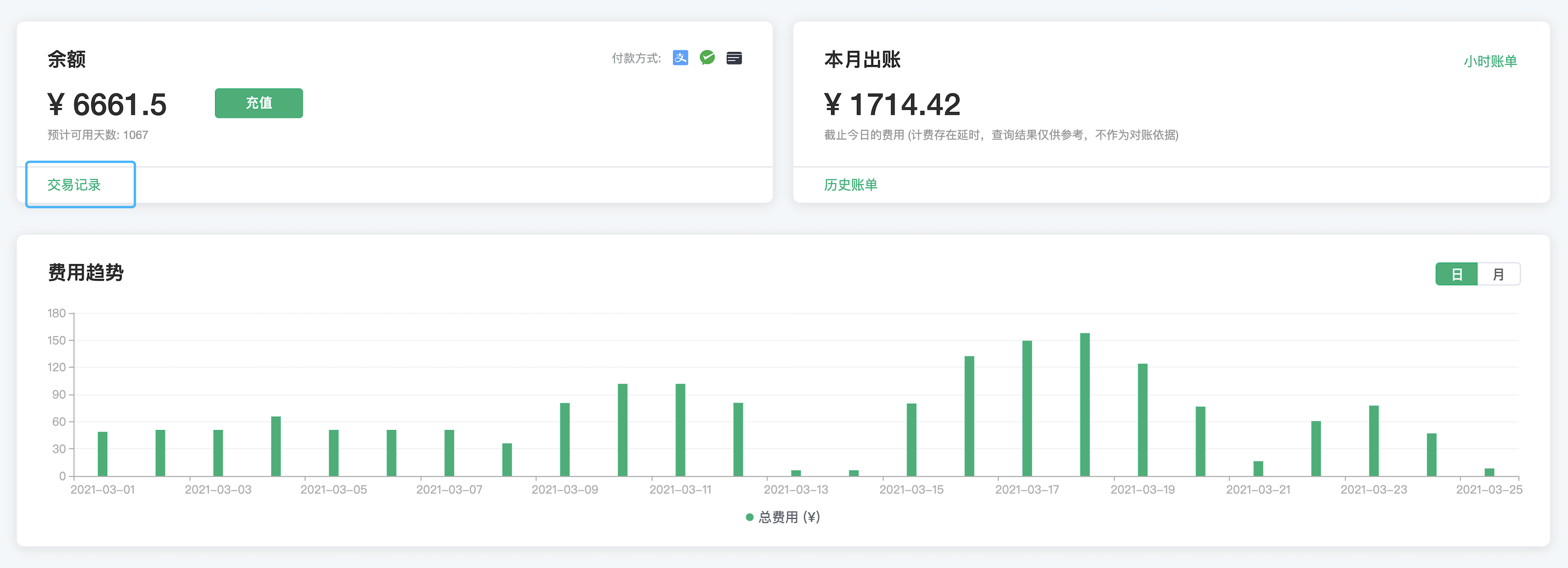 费用趋势显示了在某一特定时期内你的账户使用所产生的费用,可以按照天或者月维度进行查看。