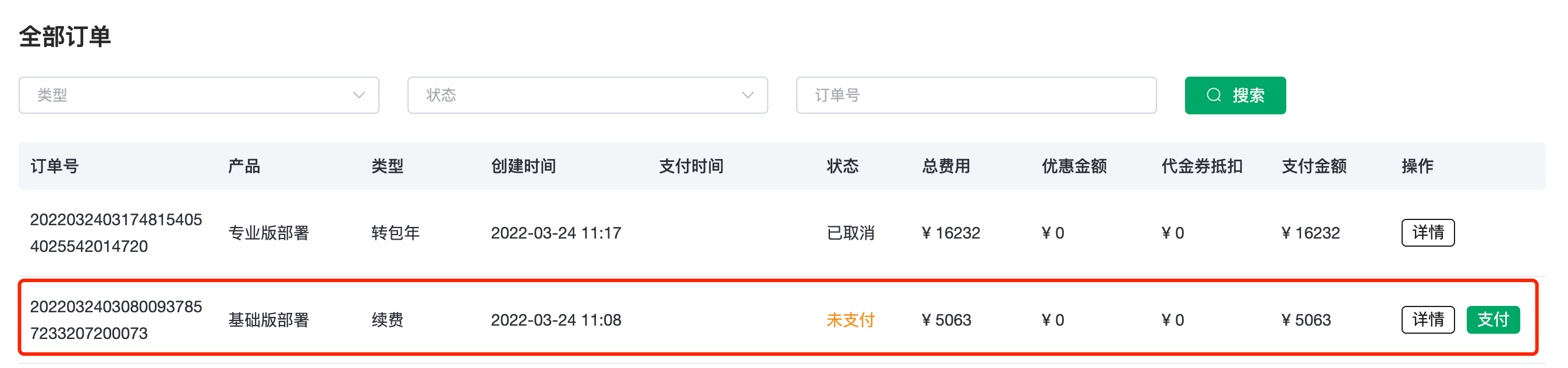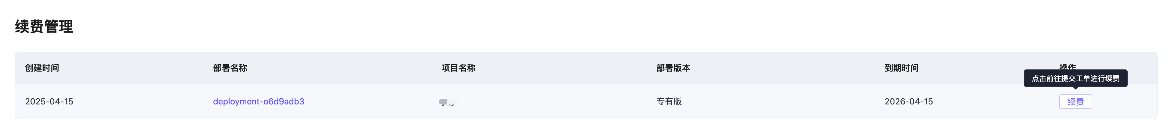 当部署距离到期日不足 3 个月时,右侧会显示续费按钮。