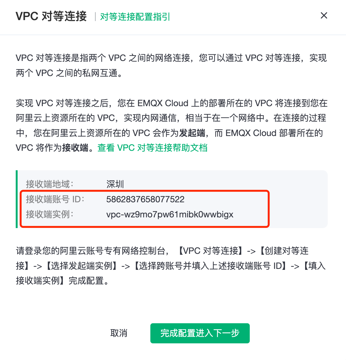 回到 EMQX Cloud 控制台,点击完成配置进入下一步,需填入对等连接 ID,该实例可在阿里云控制面板找到,填写完以后点击完成并进行配置路由。