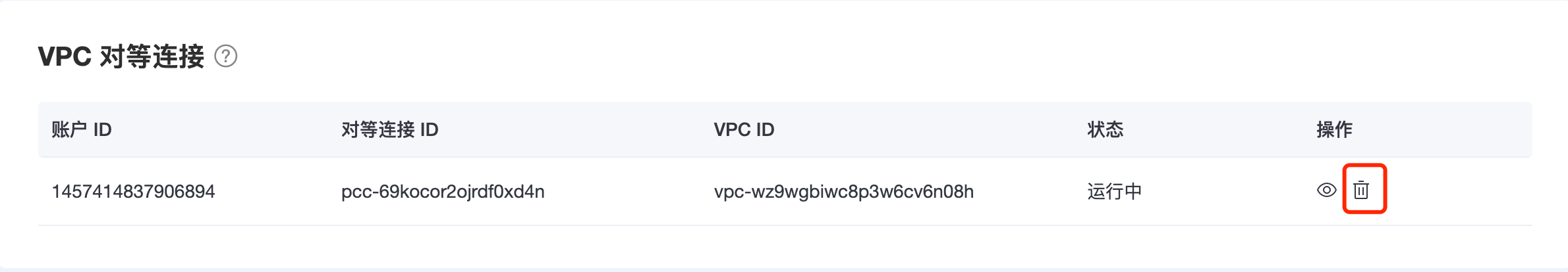 - 点击 VPC 对等连接操作列中的“删除”图标,点击确认后完成删除。