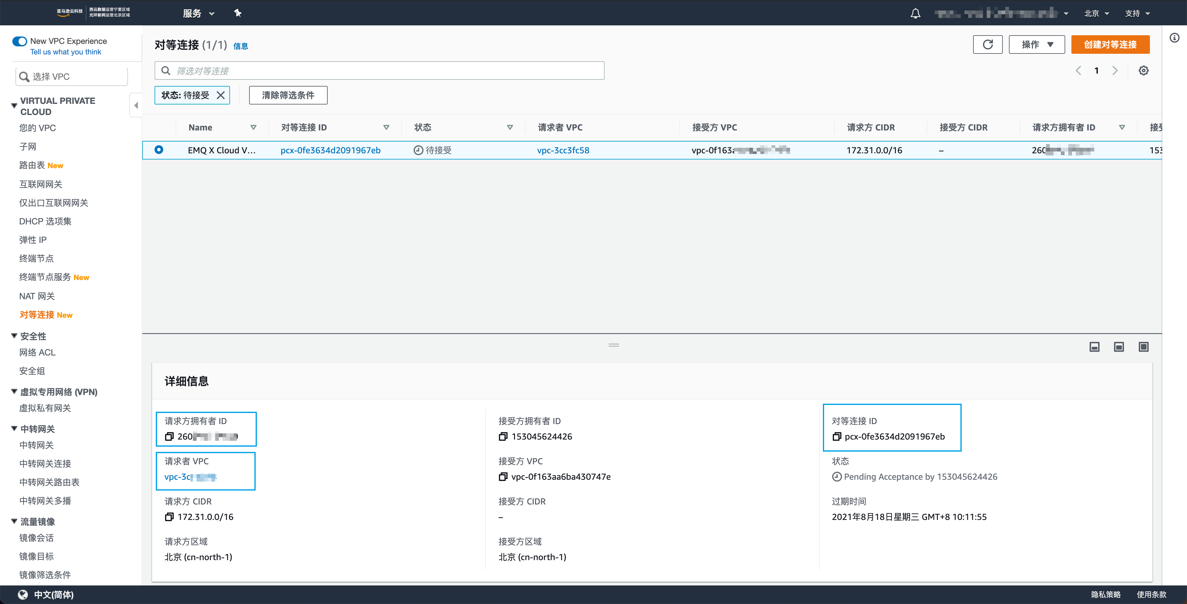 请求方拥有者 ID、请求者 VPC、对等连接 ID,后面的步骤用将会用到这些信息。