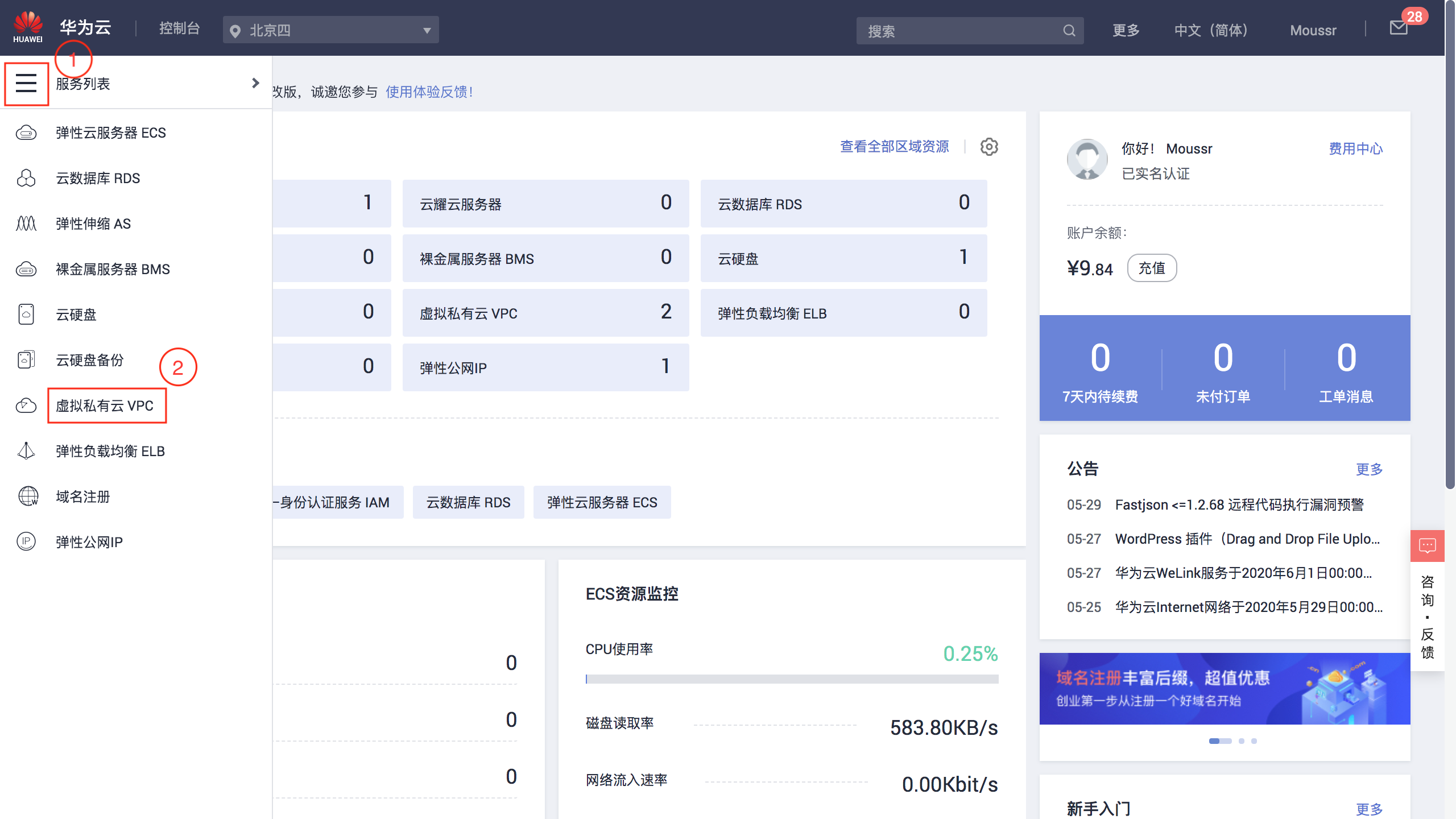 登录华为云账号,进入控制台 -> 虚拟私有云 VPC。