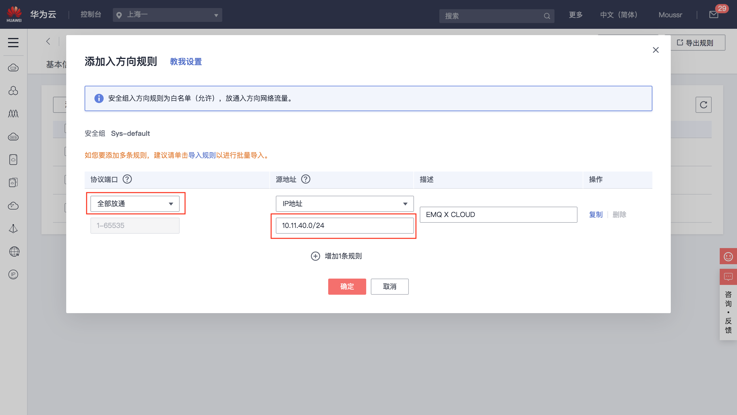 在华为云控制台里配置安全组,允许 EMQX Cloud 网段访问您的 VPC。