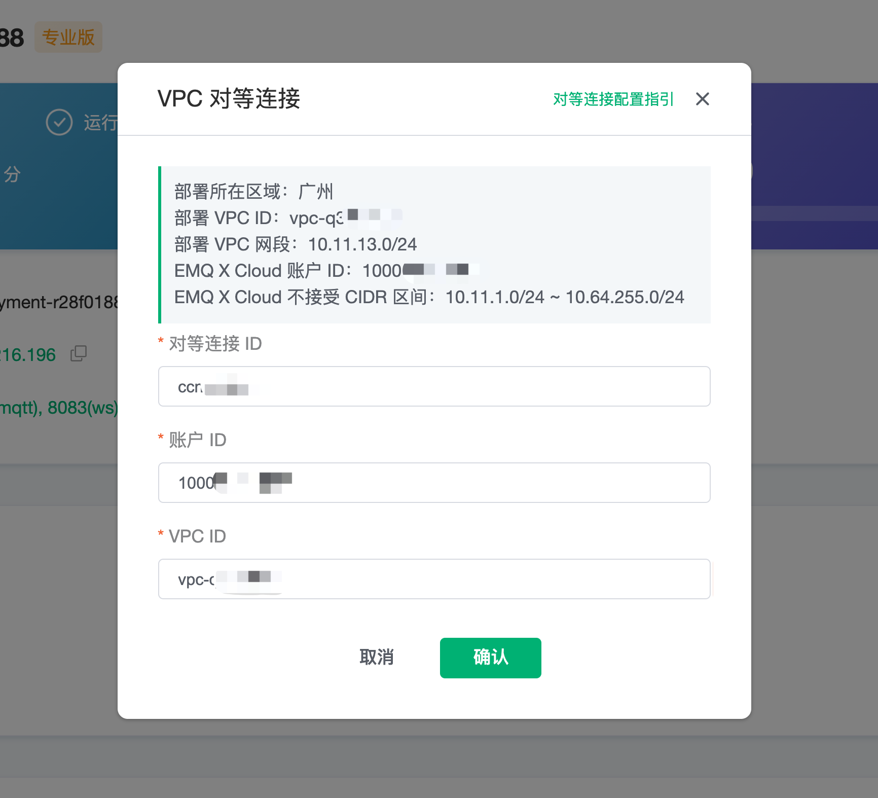 回到 EMQX Cloud 控制台,填入步骤 3 记录的信息,然后点击确认,完成对等连接。