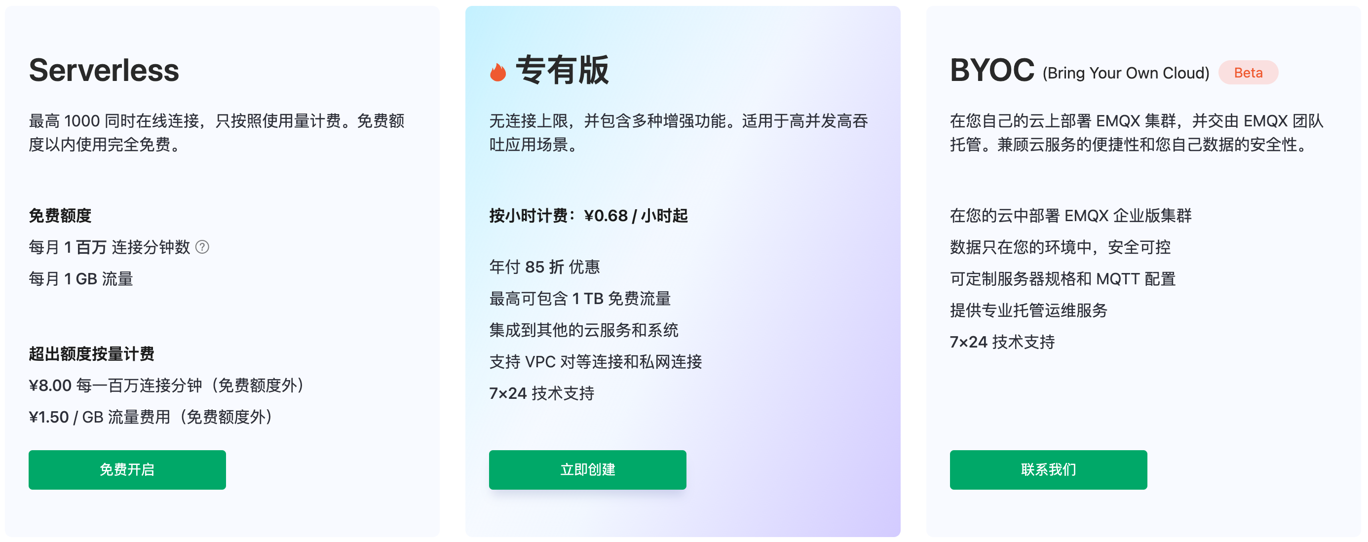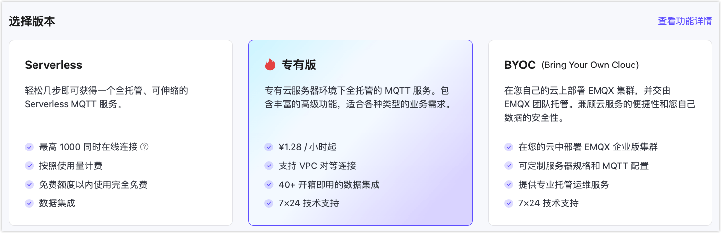 EMQX Cloud 提供三种不同的产品版本,让您能够在全球热门的公共云上部署完全托管的 MQTT 服务。无论您是独立开发者还是全球行业领袖,您都能找到适合您需求的 EMQX Cloud 产品。
