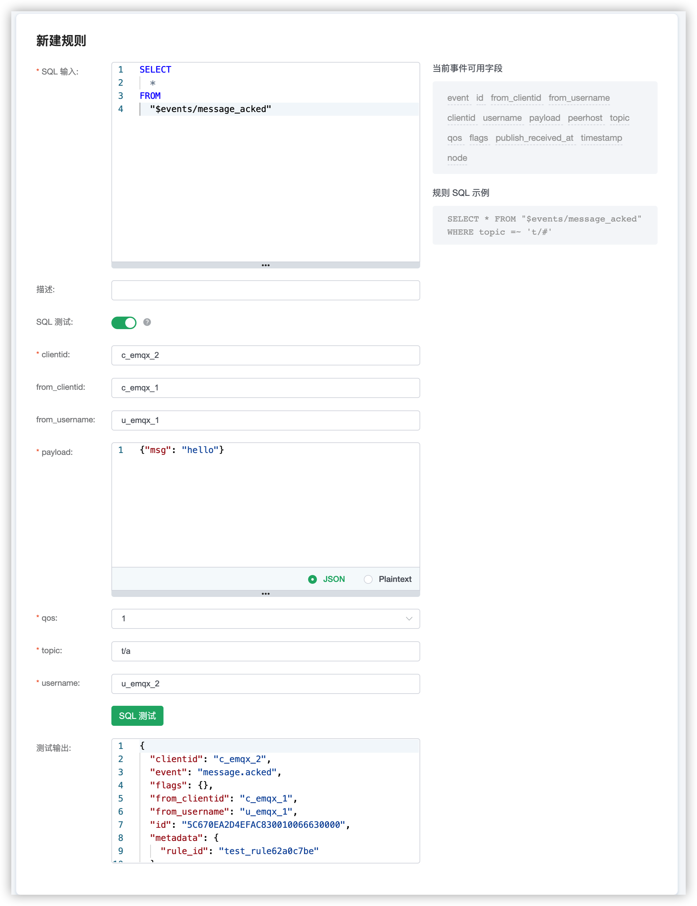 当消息发送到客户端,并收到客户端回复的ack时触发规则,仅QOS1,QOS2会触发。