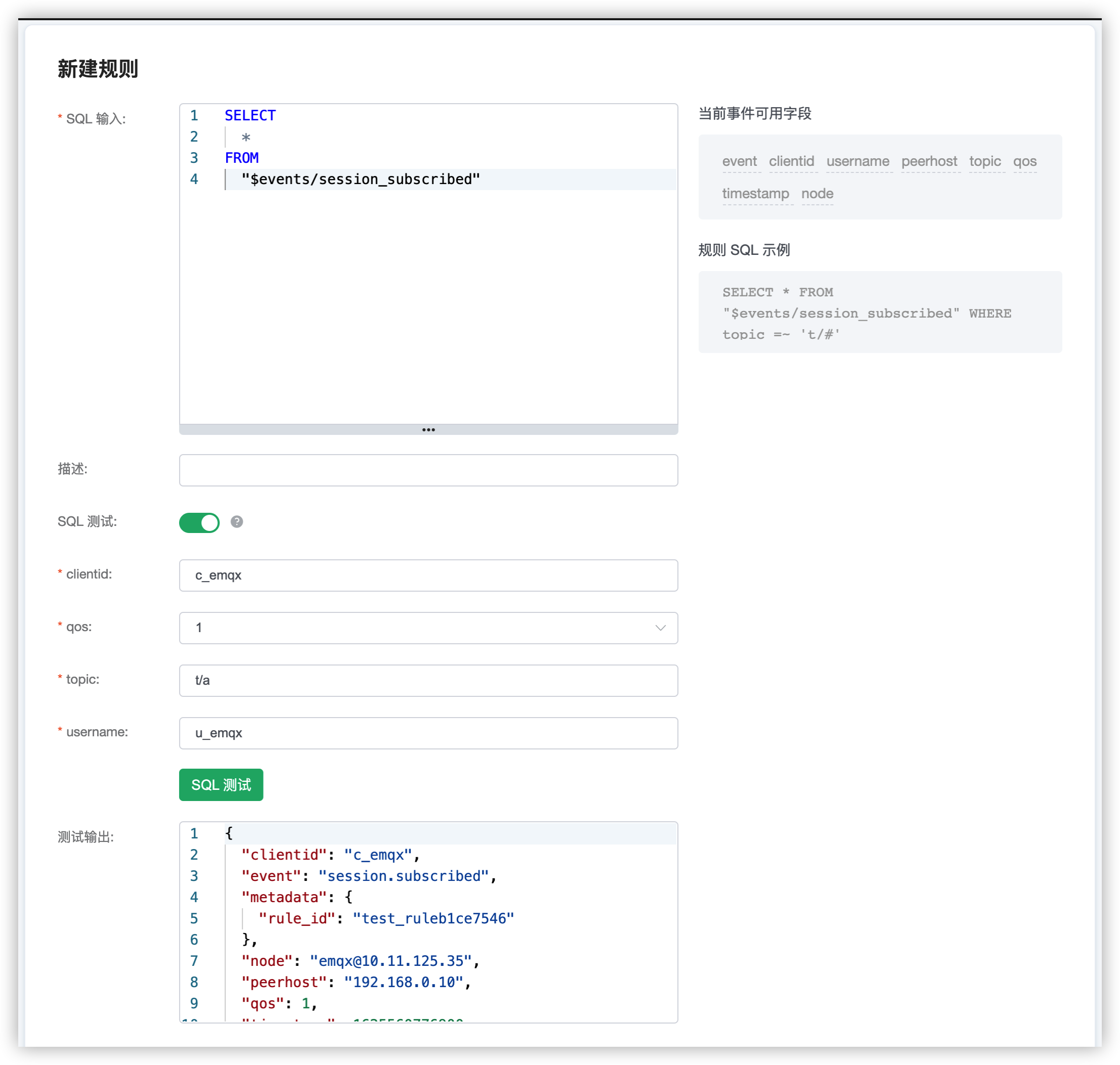 规则的 SQL 语句既可以处理消息(消息发布),也可以处理事件(客户端上下线、客户端订阅等)。对于消息,FROM 子句后面直接跟主题名;对于事件,FROM 子句后面跟事件主题。事件主题以 $events/ 开头,比如 $events/client_connected,$events/session_subscribed。