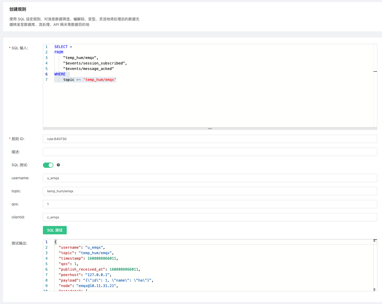 数据集成,找到规则面板,点击创建,然后输入如下规则匹配 SQL 语句。我们将主题为temp_hum/emqx的消息信息读取出来。规则 SQL 的 FROM 语句说明: