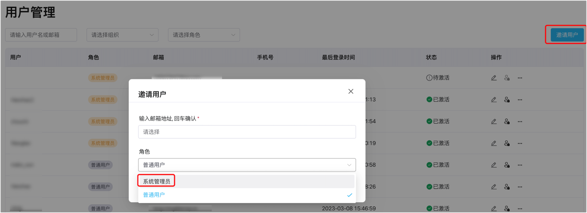 作为系统管理员登录 ECP,在系统管理页面,点击并进入用户管理界面。在此页面点击创建用户(或邀请用户),完成必要的设置并将用户指定为管理员或普通用户。