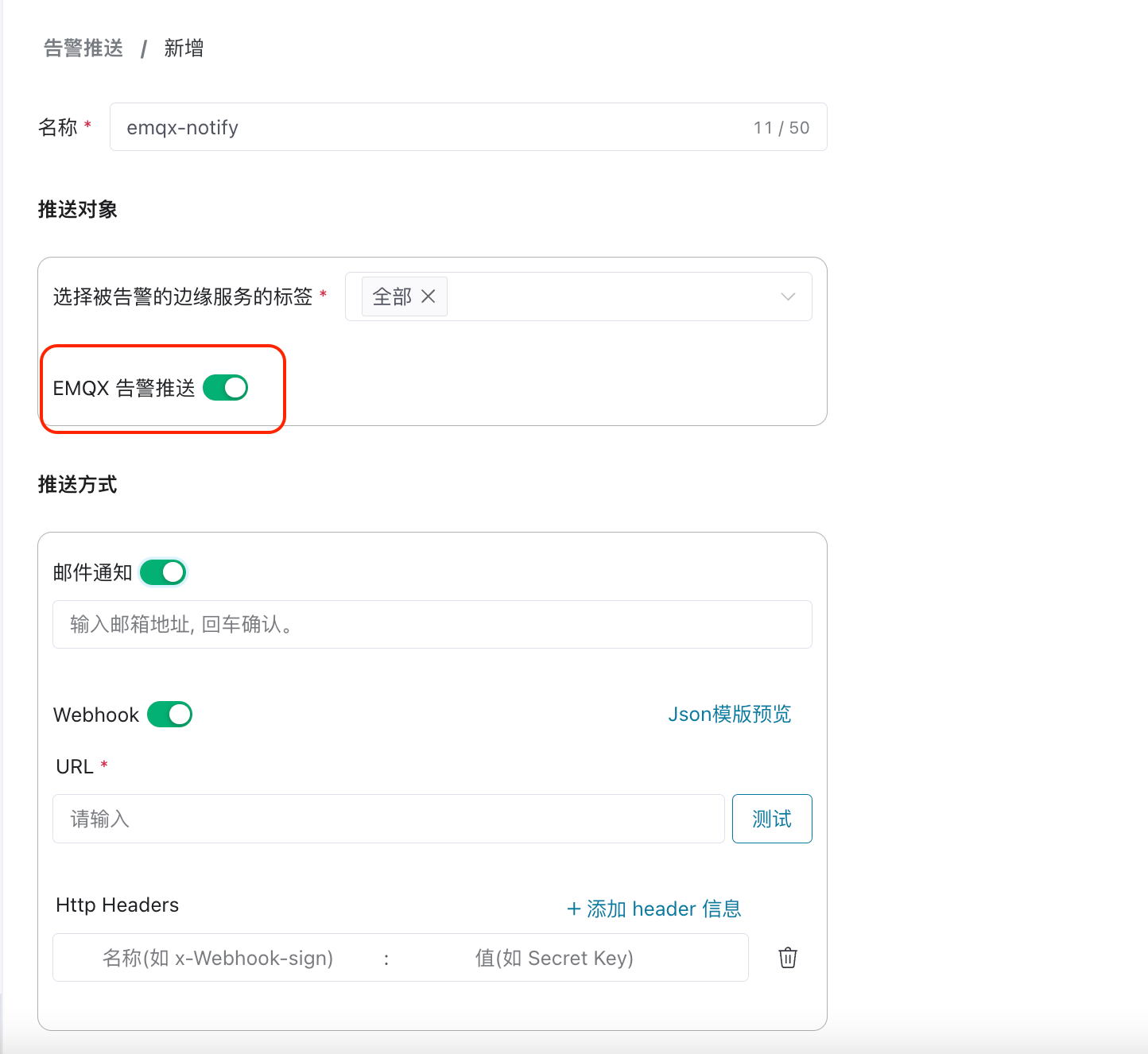 如果您需要对集群中发生的告警设置邮件或 Webhook 通知,在创建告警推送时请启用“EMQX 告警推送”。
