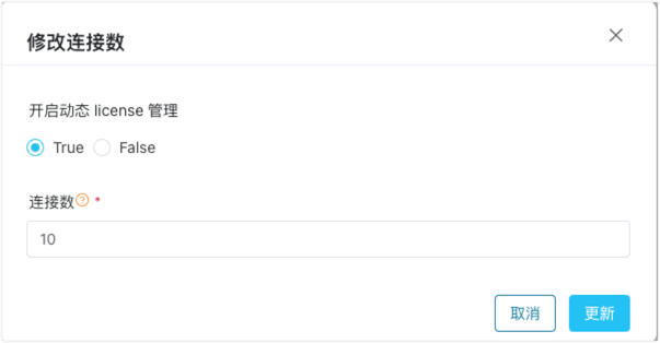 True选项开启,然后设置所需的集群连接数。如果修改成功,稍等片刻更改即生效。如果需要关闭目标集群的动态 license 管理功能,点击
