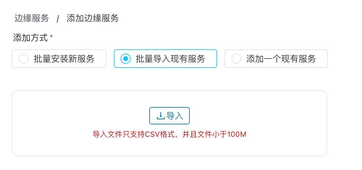 ECP 支持添加一个现有边缘服务,或者通过 CSV 文件批量导入现有边缘服务。