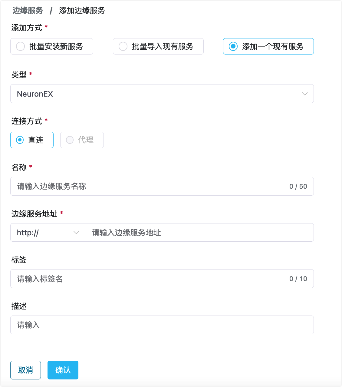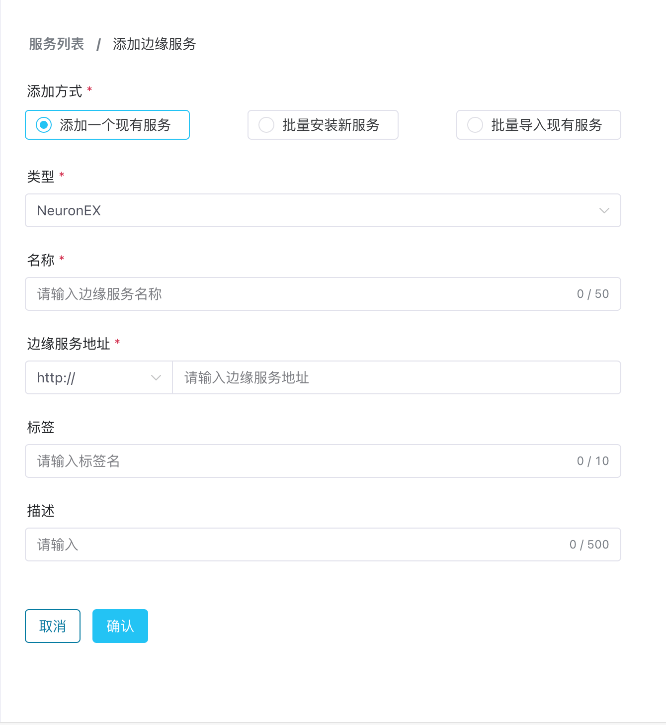 - 点击添加边缘服务按钮,进入添加边缘服务页面。