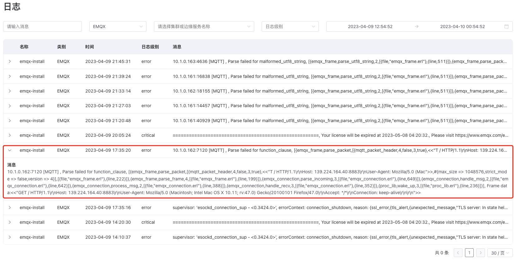 例如,要定位 生产 集群中关于 EMQX 许可证 的一条 Critical 级别、且发生在 2023-04-18 日的一条日志: