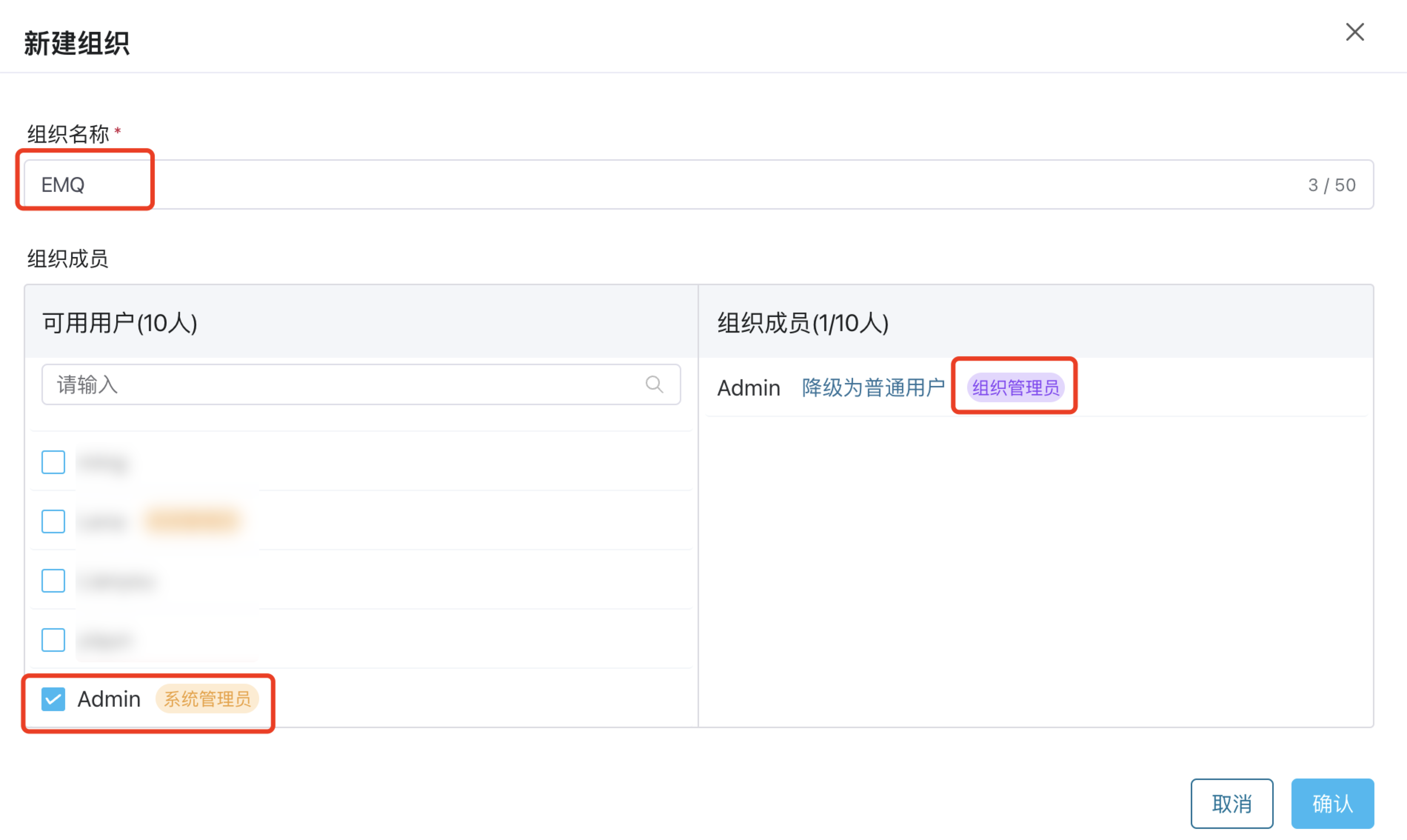 - 在左侧的组织成员列选择组织成员,并设置为组织管理员;