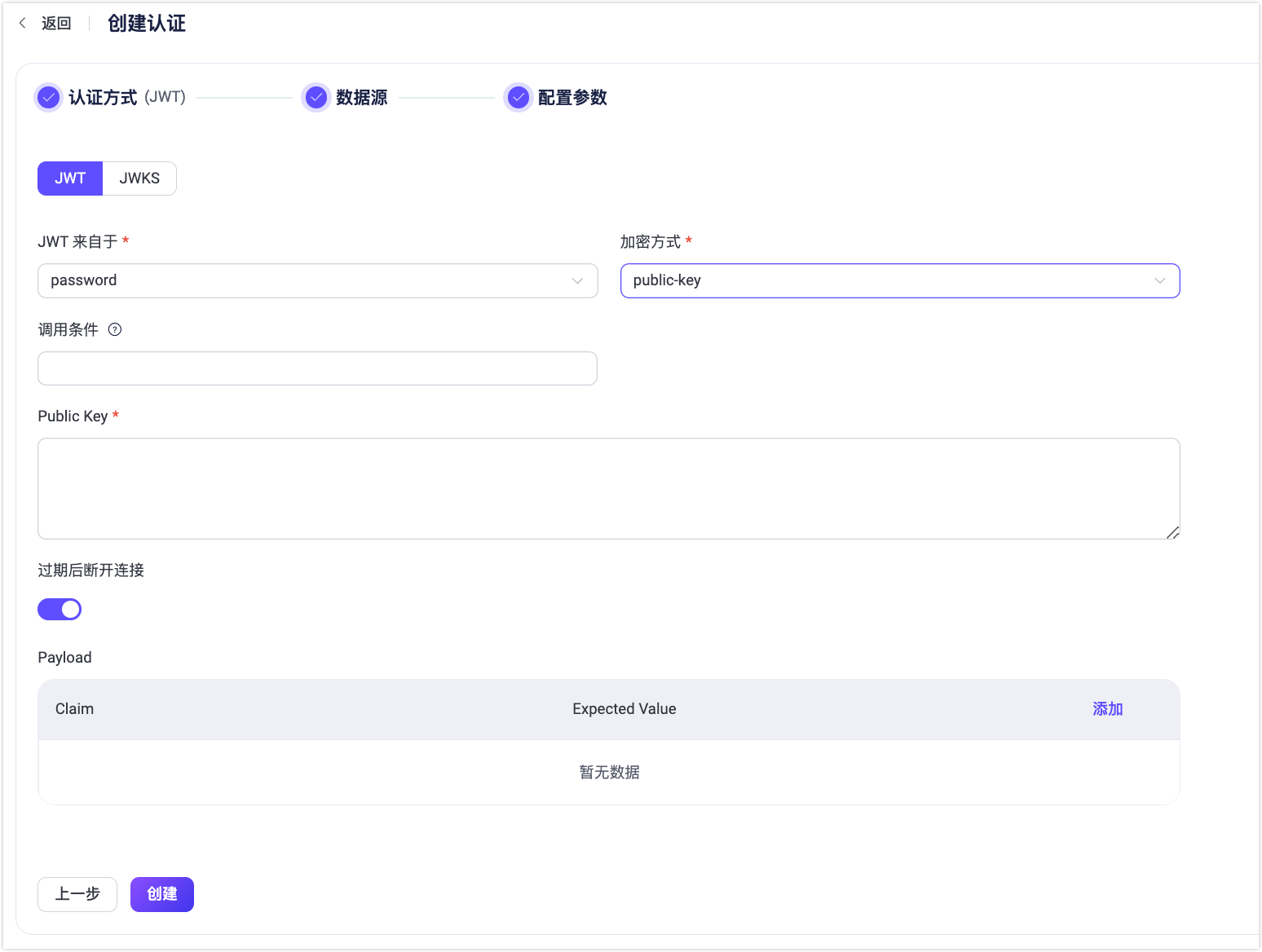 在随即打开的认证页面,点击创建,选择认证方式为 JWT,跳过数据源设置部分,进入配置参数页签。